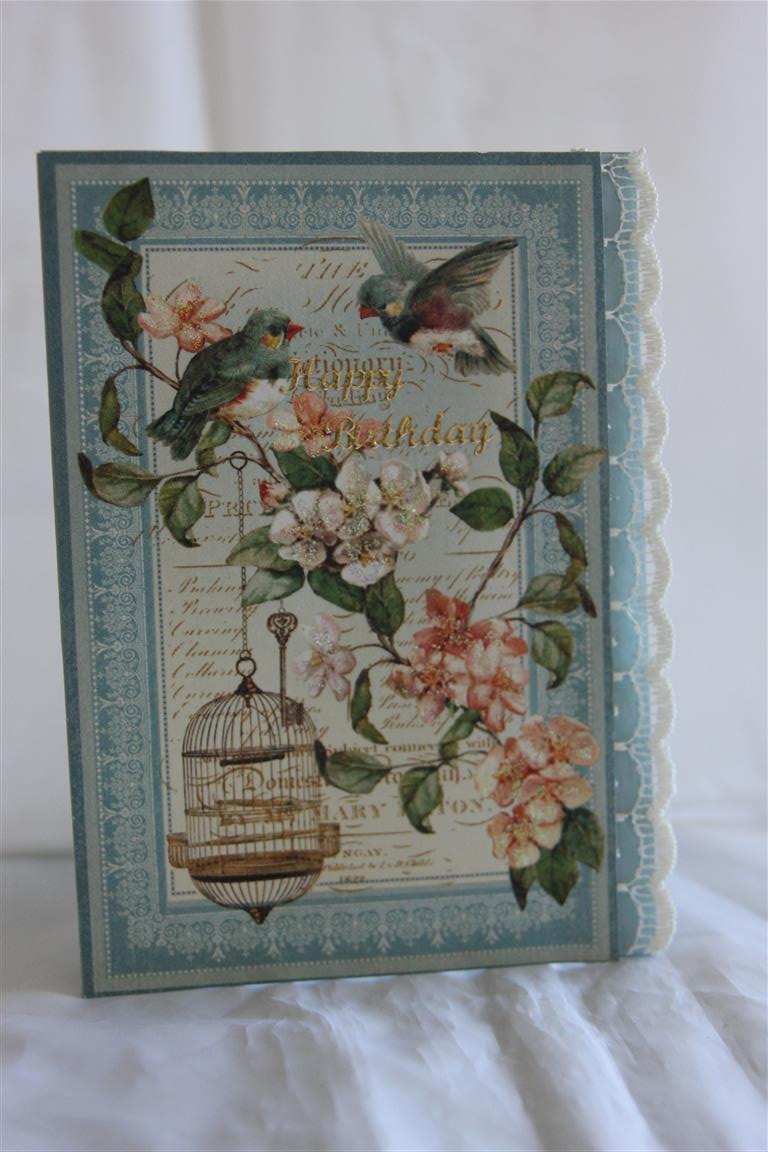 Graphic 45 secret garden patterned paper, and the image on this panel of paper doesn’t need anything else but a strip of lace! The cardstock is stampin up baja breeze. very quick and easy! the weather is still conspiring against me, as well as hot it is now humid and there is so much moisture in the air my cardstock is warping so again no visits to the craft room, although I did manage to make a few this morning before it really heated up- ready for a change of weather now…. til tomorrow…