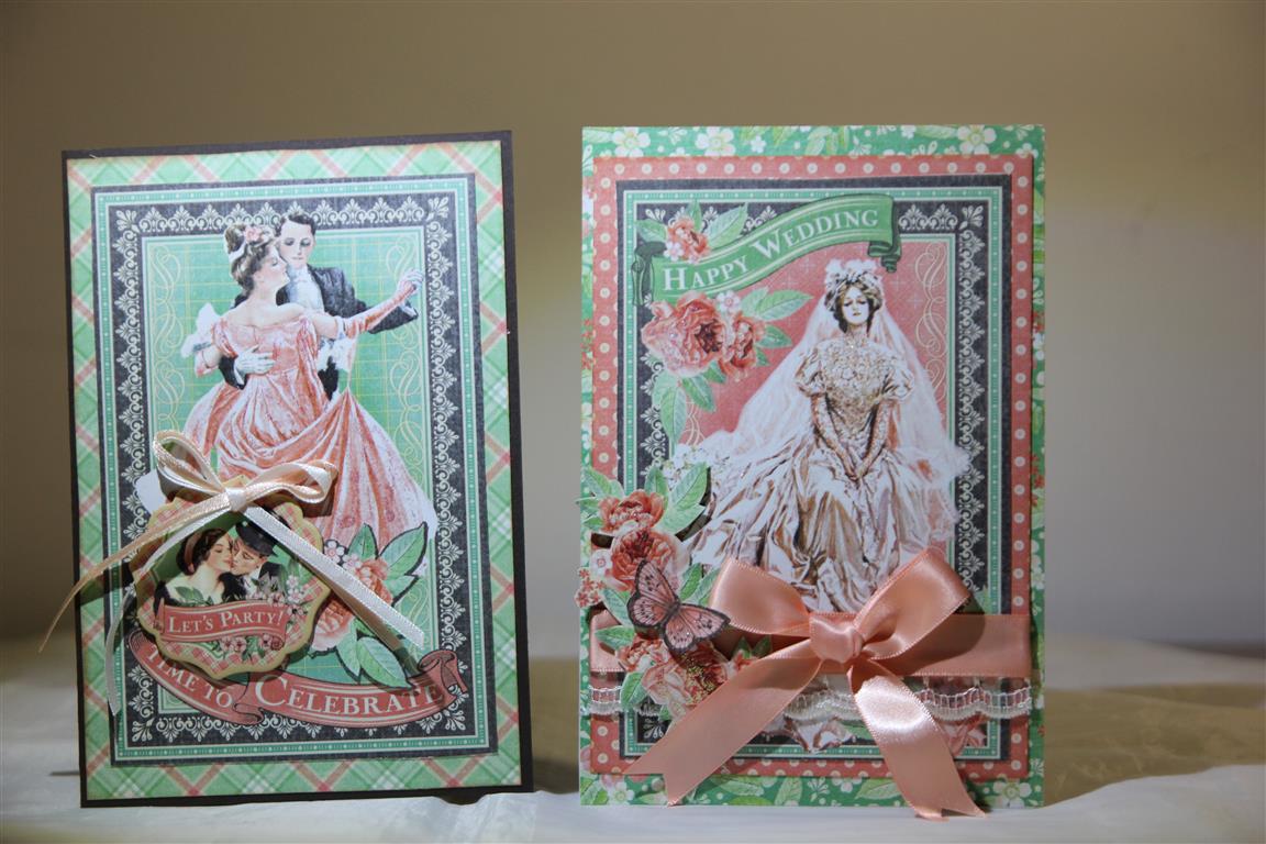 It is a very versatile paper, this Graphic 45 Time to celebrate.. so far we have had wedding,baby, and now graduation and little girl birthday!The top card has lots of fussy cutting, and a bit of layering. the bottom card is much simpler with just a bit of ribbon and lace to decorate. I taught a class this morning, and normally when I get home I go into the card room feeling all inspired, but today is just far too hot, – about 38C at the moment, so I will be found curled up in my chair under the air conditioning reading a book! Til tomorrow…..
