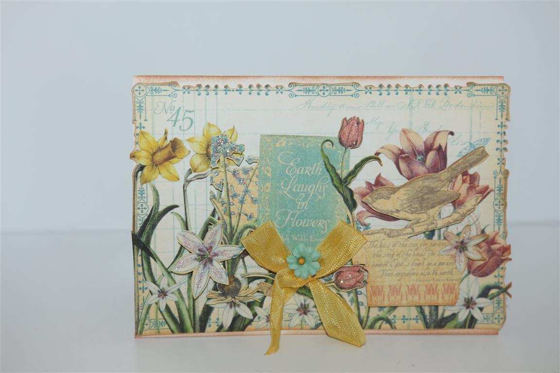 Over the next couple of days I will post a few cards I made with Graphic 45 Time to celebrate, this time the two April sheets. I used a card front for this one, and did some fussy cutting, and just added a seam binding bow.In the craft room meanwhile I still have simple stories on the table ,left there from the weekend, and I am determined to finish all the bits and pieces I have left – so far I have made 25 cards with that paper ( not counting the 10 I have made for a class in may) .. I am inspired with that paper! til tomorrow….