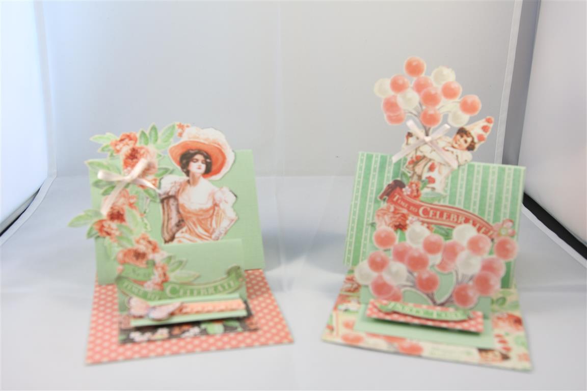 What lovely weather we had for a short time today! It was lovely to feel the sun on my face, although it has grown rather overcast now, I am glad to have had the opportunity to get all my washing dried! I taught a full class of 18 this morning with 5 new cardmakers as well, so I was very busy, but so enjoyable! Talking of classes , todays cards are actually a couple of cards we did in a previous class of mine. Paper is graphic 45 Time to celebrate, and they are double easel cards. No other embellishing necessary, just the papers, a fair bit of fussy cutting, and a couple of ribbon bows.Looking forward to this weekend, when I will be making a start on Octobers lessons. Time is flying – it will be Christmas before we know it, and that will be the theme for October! Til tomorrow….