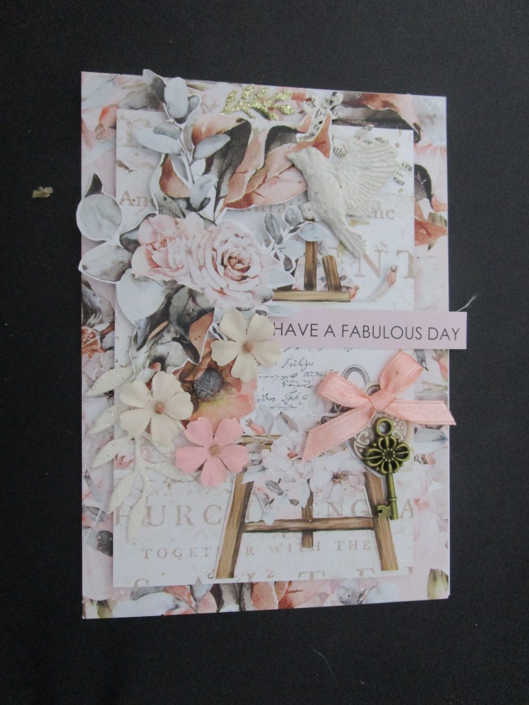 I have started Christmas cards! I have worked out a way to work my way through my stack of papers without losing interest! I just make a few cards from a collection and move on, so this week it is a kaisercraft collection from last year called Peppermint Kisses. I had the 6″ pad, collectables and a sheet of imagery (12 x 12) which I fussy cut. I didn’t add very much, just a ribbon, bit of lace and some glittery die cuts. It’s been very wet and windy here this week, perfect weather for staying inside next to the heater! i hope all is well in your world, til next time, stay safe…
