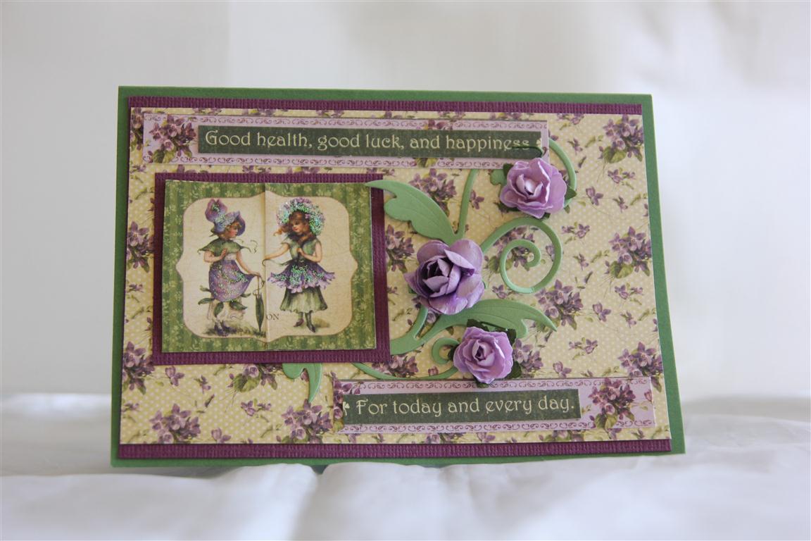 Here is the last card I made with my 2 sheets of Graphic 45 A place in time March cut outs. tomorrow we will move on to some cards with a tropical beach theme, in keeping with the very hot weather we are experiencing here1. Here I used stampin Up garden green cardstock, some lovely purple bazil, a cheery lyn tropical flourish die and a few flowers. the image was actually two, which I folded in half, lined up the bracket shape and stuck them together. Thats all for today, I am teaching a lesson tonight so must go and get organised. Til tomorrow…