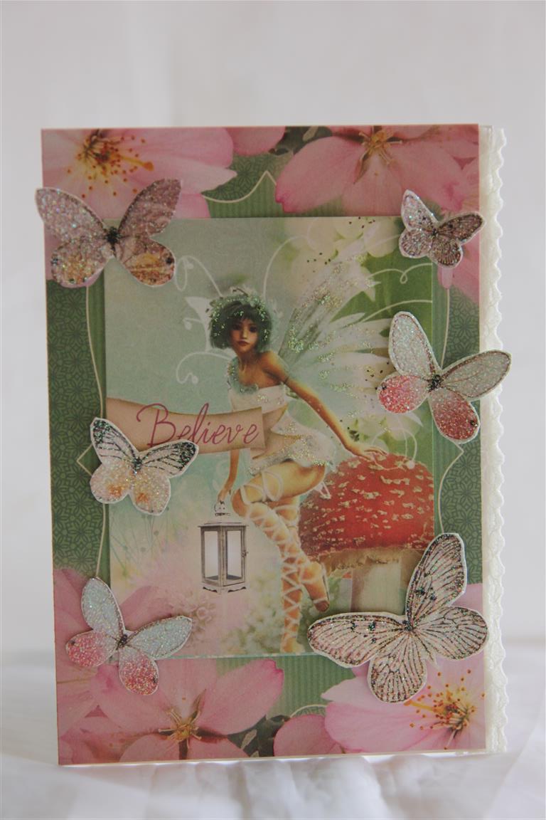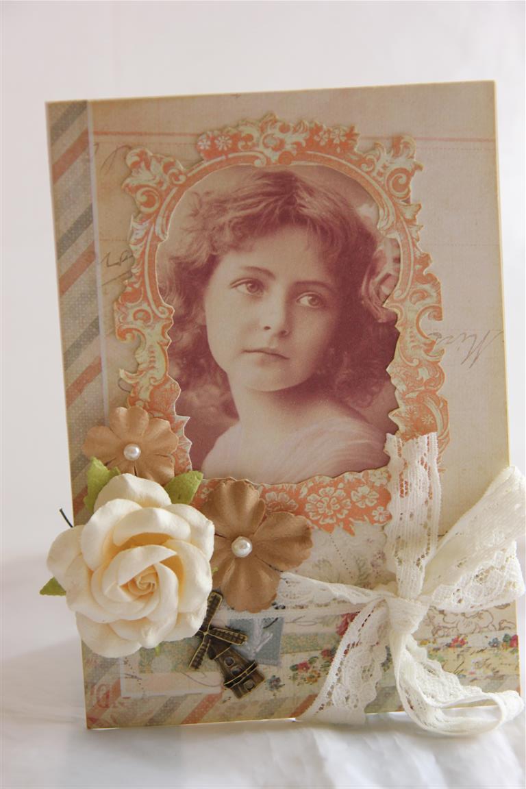 Sorry I missed last night post, but I am not well – terribly sore throat – voice is not good, and I came home from work yesterday and fell asleep for a good long while! Still no better today, and I am hoping I am better for my class tomorrow otherwise I will be relying on sign language to give instructions! Todays card is the other card I had time to make using Prima Delight paper, ( love the image), and lace, flowers and a charm. I fussy cut the whole frame and mounted the girl image behind it. I think this evening I will pull out this paper and look at it again, see if I can do any more fussy cutting while I am watchingb tv. Til tomorrow….