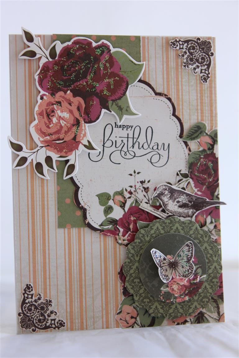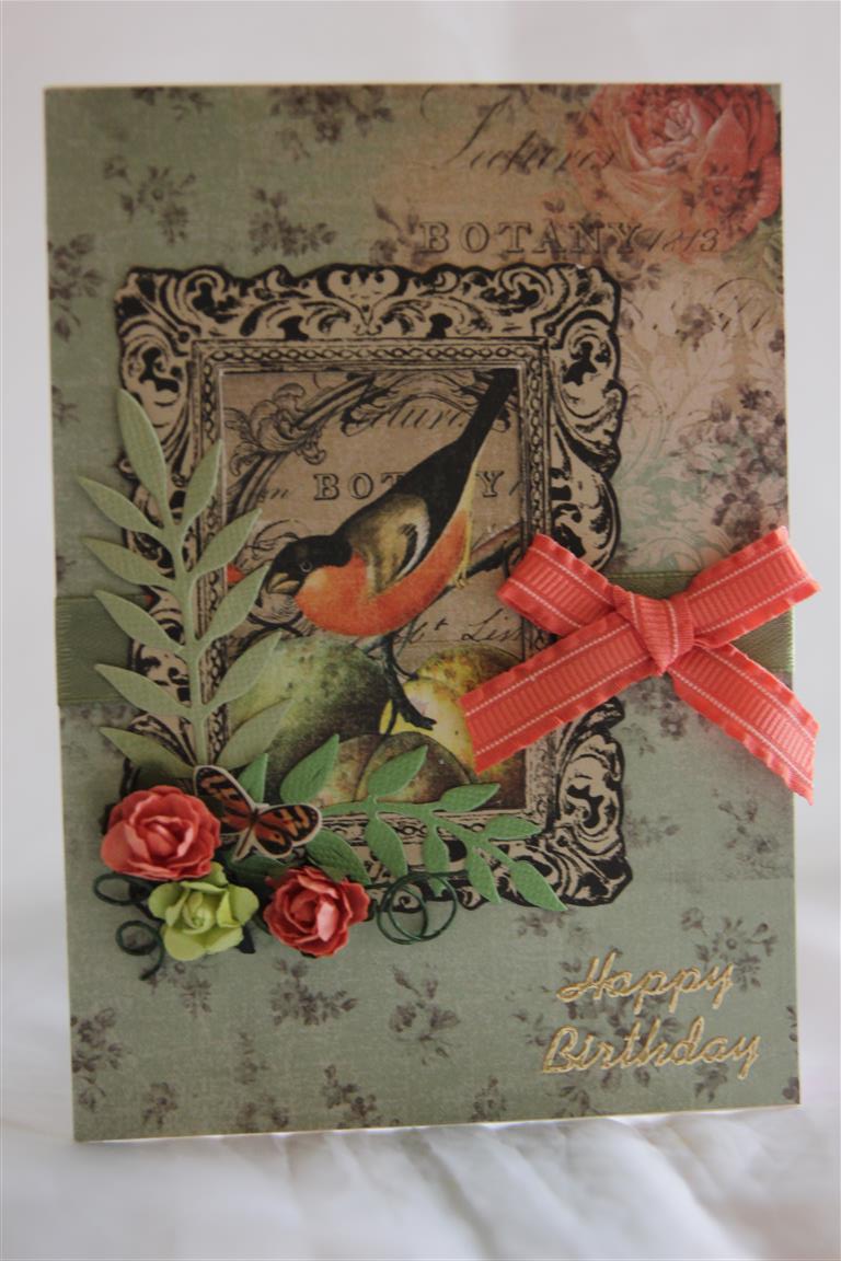 Card number 3 using Kaisercraft Curiosity collection. For this one I just used the papers – The background paper is from the 6″ pad, and the frame and bird image which i put behind the frame is fussy cut from a 12 by 12 piece. I die cut some leaves, and added some kaisercraft flowers to finish.In a rush tonight – a bit of a kitchen disaster involving a faulty toaster and the fire brigade so have a bit of cleaning up to do…. til tomorrow….