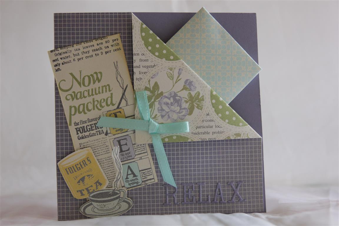 Still with Stampin Up Afternoon Picnic designer series paper, and another colour way.This time I did a 6″ by 6″ card, and made an envelope using my memory keepers envelope maker. Used the smallest size, and popped a tea bag inside it.I fussy cut some of the images from the paper, and die cut the word relax using a Die- Versions die – editor-in chief die. I turned back the paper to leave a pocket for the envelope, and added aribbon bow. Today I have put aside the christmas stash and have been working on some mens cards, and a couple of birthday cards for family members, al in all a nice crafty day! til tomorrow…