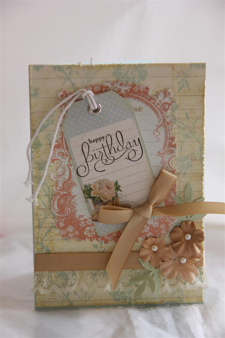 A bit of a break from christmas cards.. Because i have been so busy with them I haven’t had a chance to have a good run with a lot of the papers i have been buying, this one included, and I can’t wait to find some time to really play with this one – Its, Prima Delight, and I have used the matching tags and flowers on this card too. I punched out some leaves, added a lovely coffeee satin ribbon, some lace, distressed and inked all my edges and done! Til tomorrow….