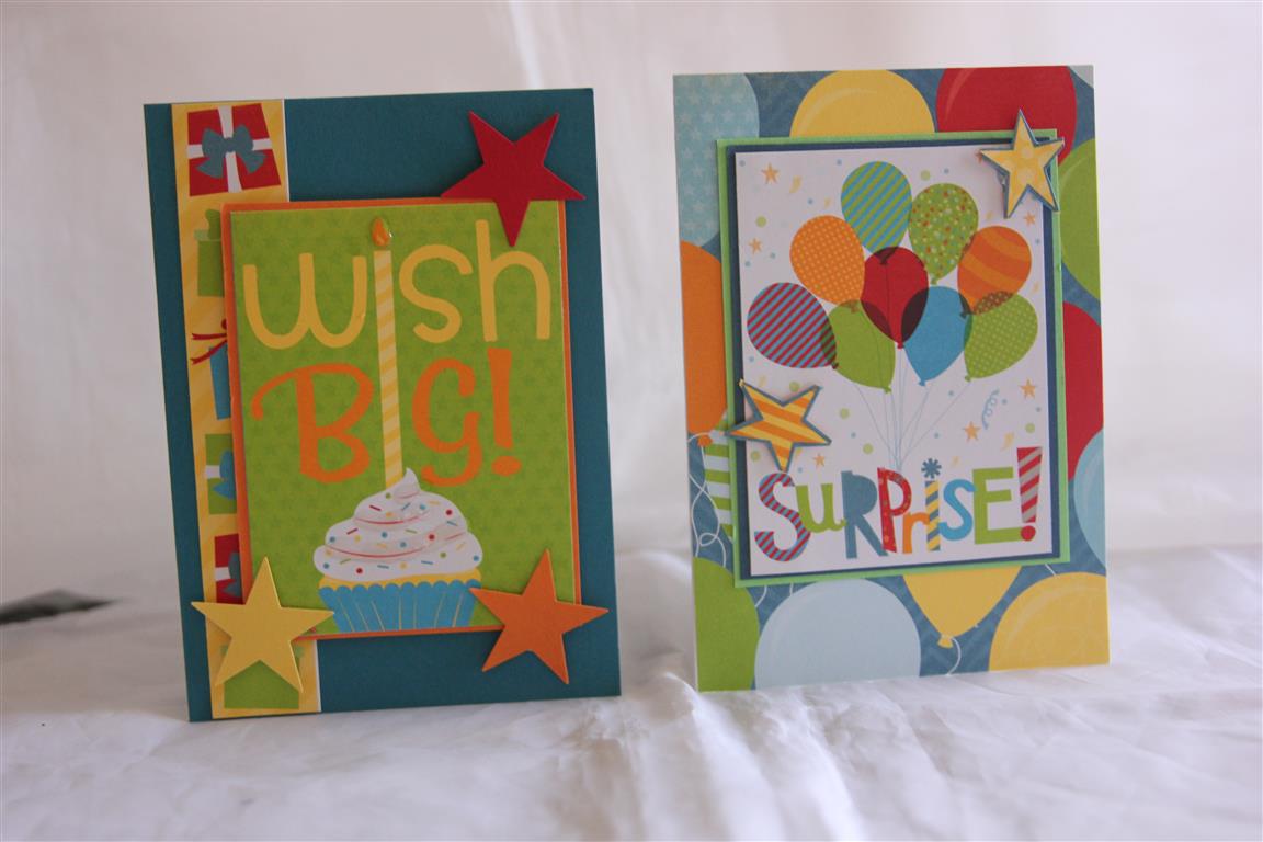 Only a couple more in this series – Bo Bunny Surprise so we will stick with them – still using the original 5 sheets of paper that I purchased, we are up to card numbers 11 and 12! I used a punch for the stars on the card on the left, and fussy cut the the stars on the right out of the paper. The cardstock used for the card bases and the mats is from Stampin Up. Til tomorrow…..