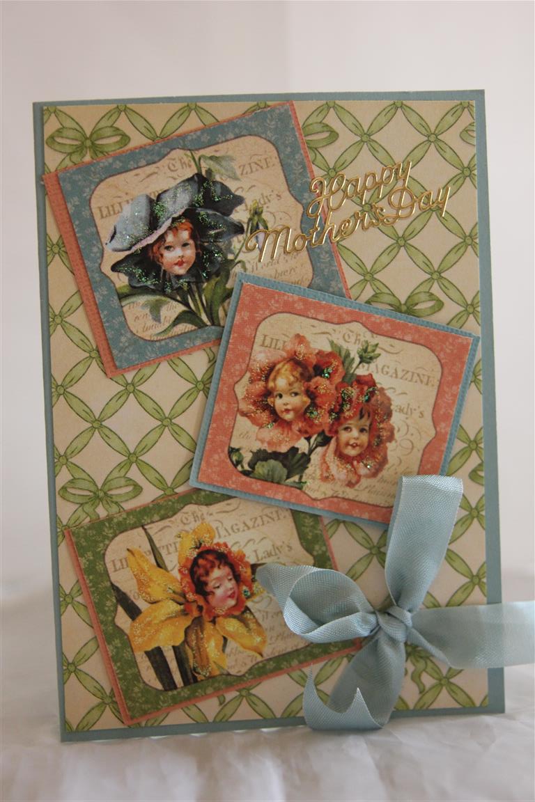 here is the last of my A place in time series using Graphic 45 papers.Sonething new tomorrow. I matted the small images using bazil and kaisercard cardstock, and added a seam binding ribbbon binding bow. I have turned this one into a mothers day card, but on reflection it would make a lovely girls card – not sure what I was thinking there!The card base is Stampin Up baja breeze cardstock, which my sister tells me is being discontinued so I have stocked up on it as it is one of my favourite colours for card bases.Seems to match a lot of the papers I have in my craft room, and I am sorry to see it go.Looking forward to spending a couple of hours in the craft room tonight after a truly hectic week1 Til tomorrow….