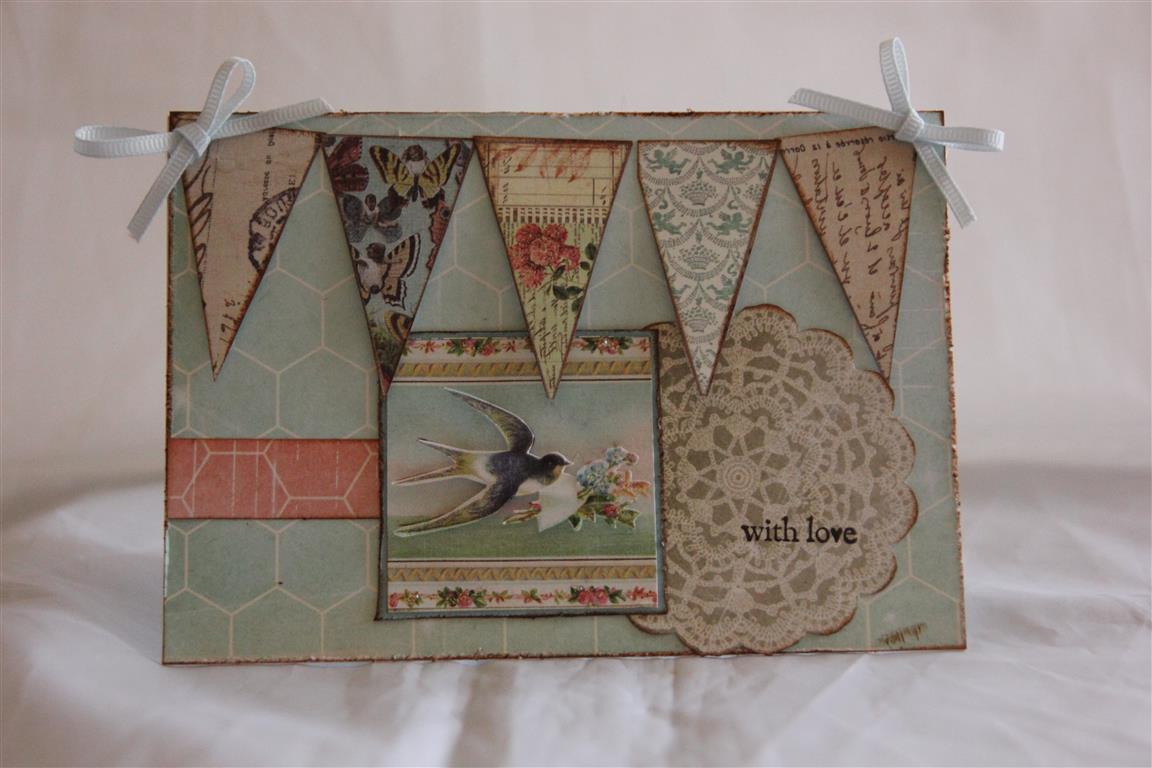 Prima Divine paper, the a4 size pad, with a little fussy cutting, and just two ribbon bows. The sentiment is a stampin up stamp. I inked all edges with tea dye ink, and cut the bird out twice and put the second one on top of the first with a couple of foam pads.The banners were already shaped like that on the paper so it was just a matter of cutting them out – too easy!Til tomorrow….