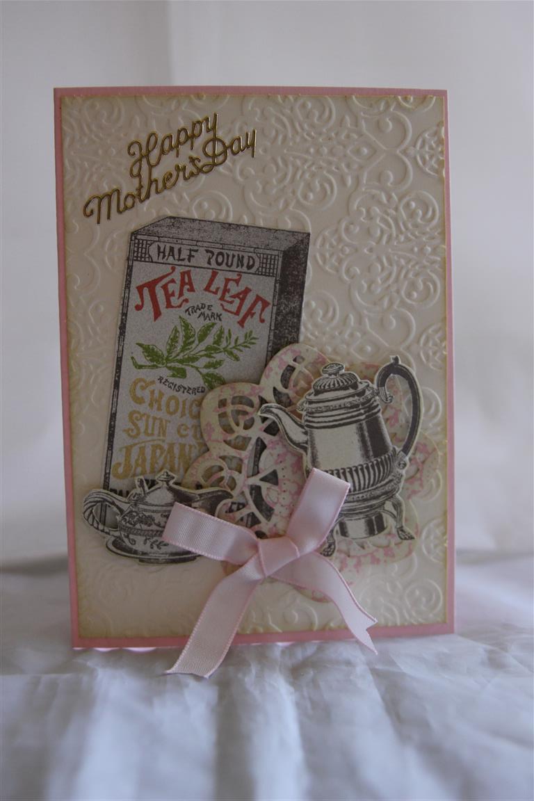 I fussy cut some images for this card, using the Tea for Two designer papers from Stampin Up.The doily is die cut from more of the paper from the same range using a spellbinders D- Lites die – medallion four, and the embossing folder used with the very vanilla cardstock is stampin up lacy brocade. The card base and ribbon are stampin up pink piruoette.I am planning tonight to spend a little time in the craft room, but we will see – it’s still very hot here, til tomorrow….