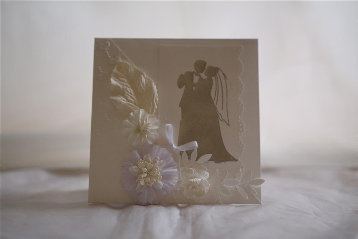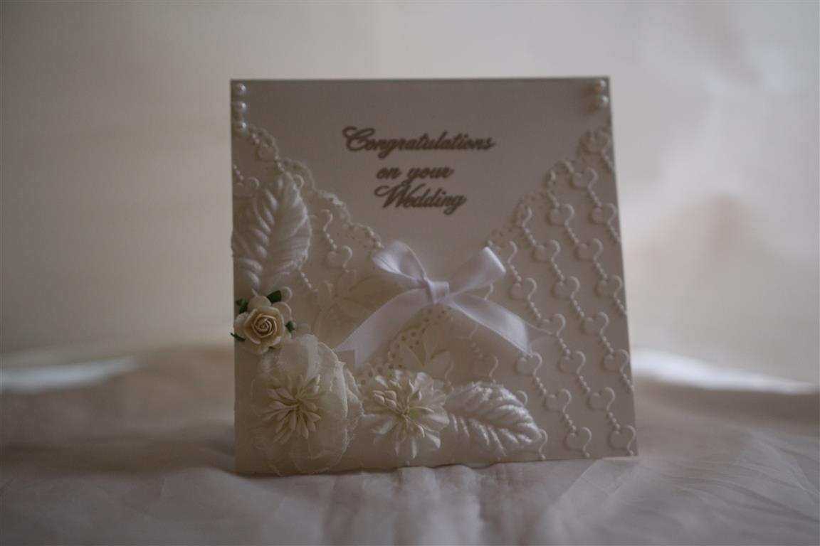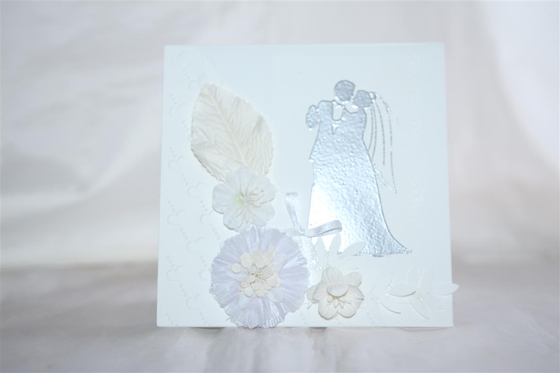 I will apologise for the quality of the photos first thing – we had terrible trouble with the light – and have discovered that morning is a much better time than afternoon for taking photos in my dining room!The first card I have posted twice as neither photo is really clear, but hopefully with the two of them you get the gist! I heat embossed in silver the stampin up marry me stamp, and did some embossing with a cuttlebug hearts embossing folder. I added prime flowers,leaves, martha stewart leaf punched leaves,and a ribbon bow to finish. the second card is a crossover front card again embossed with the cuttlebug embossing folder, gold heat embossed sentiment, and assorted flowers, leaves and pearls to finish. I will show a couple more wedding cards next time – I had to make a few for a commission. I taught a great class this morning, always good to see my ladies, and now I will have to start thinking about what to cook for tea…Til tomorrow…..