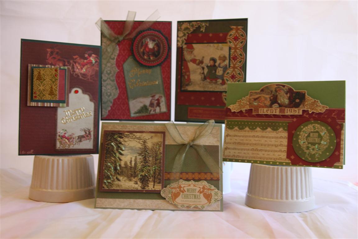 Here is another group of christmas cards, this time using Kaisercraft december 25th 6″ pad and I believe a sheet or two of 12 x 12. Just added ribbon and kindyglitz. I had to go and check which kaisercraft range this was, and see that I have quite a bit left, and I’m quite tempted to make a few more, although I am sure I am done with xmas but I have been working on a simplified triple easel card which I think I have perfected and this paper would be perfect – maybe when Nathan gets his camera back I will turn it into a video clip to show it off! Til tomorrow…..