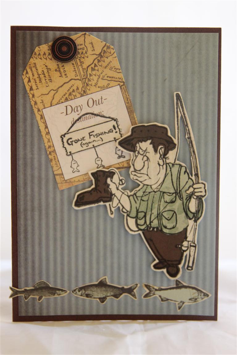 For a bit of a change I thought I would show this humorous card I made using a stamp set I found while on holidays last year in a little craft shop down the coast. The brand name is Sullivans, and I haven’t seen it anywhere else, but it has some great images in the set, including this one of a rather unlucky fisherman! The papers I used were Kaisercraft Hunt and gather, and I stamped the fisherman a few times, and paper pieced him back together to get this effect. This is my favourite way of stamping.Today I have been making more Mothers Day cards with my new papers, but no photos yet as my photographer has been tied up all weekend with photos for their wrestling shows. They had 2 in a row this weekend, so he has been super busy.Now to organise tea, and then maybe another hour in the craft room.. Til tomorrow….