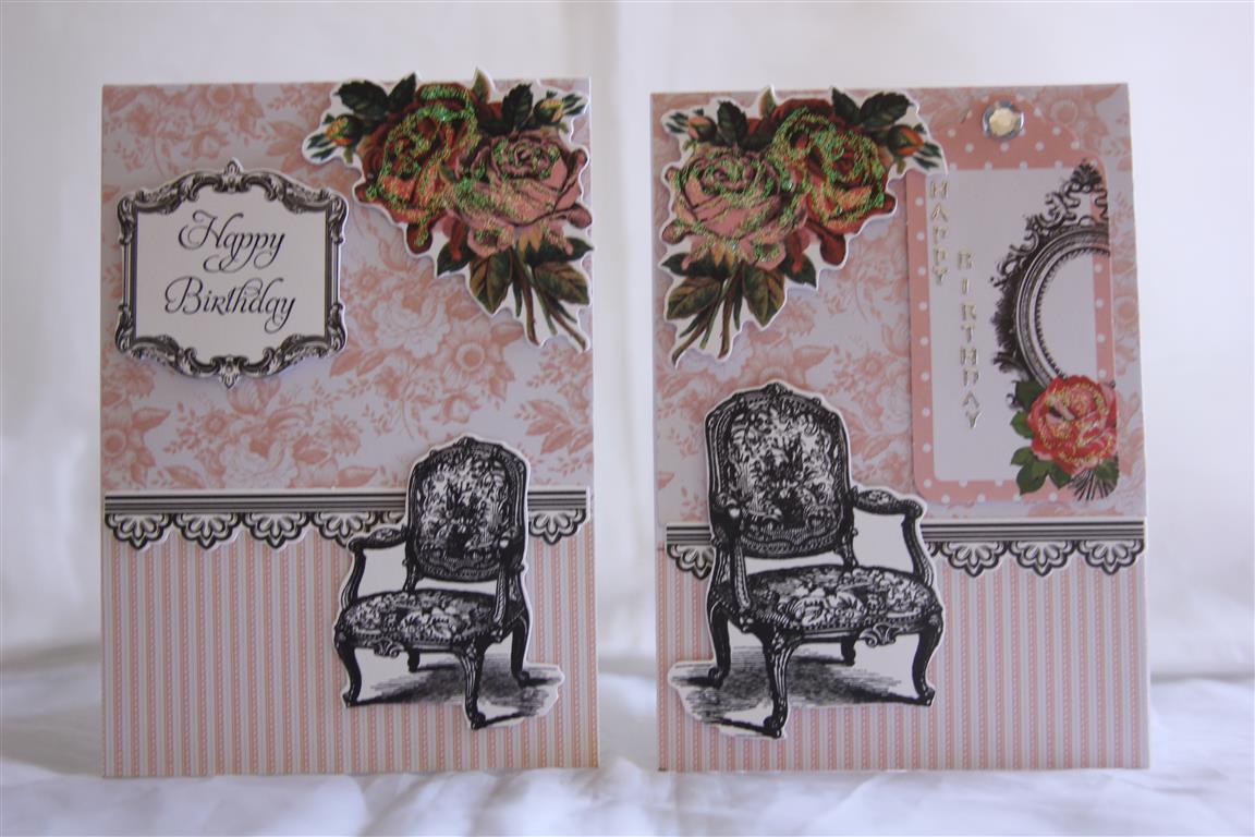 Quick post tonight, as Tea is cooking as we speak! Here are my last two cards made using Kaisercraft Porcelain Rose, so tomorrow we move on to something new! I made good use of the collectables for these cards, used the 6″ pad for the backgrounds, and created a little scene using the border strips, chairs , flowers and tags ( which I used as pictures on the wall) I loved working with this collection, the colours were so varied, and the range of cards I made all looked different. I have none of these cards left now as they all sold at my craft fair stall.Off now to dish up tea, Til tomorrow….