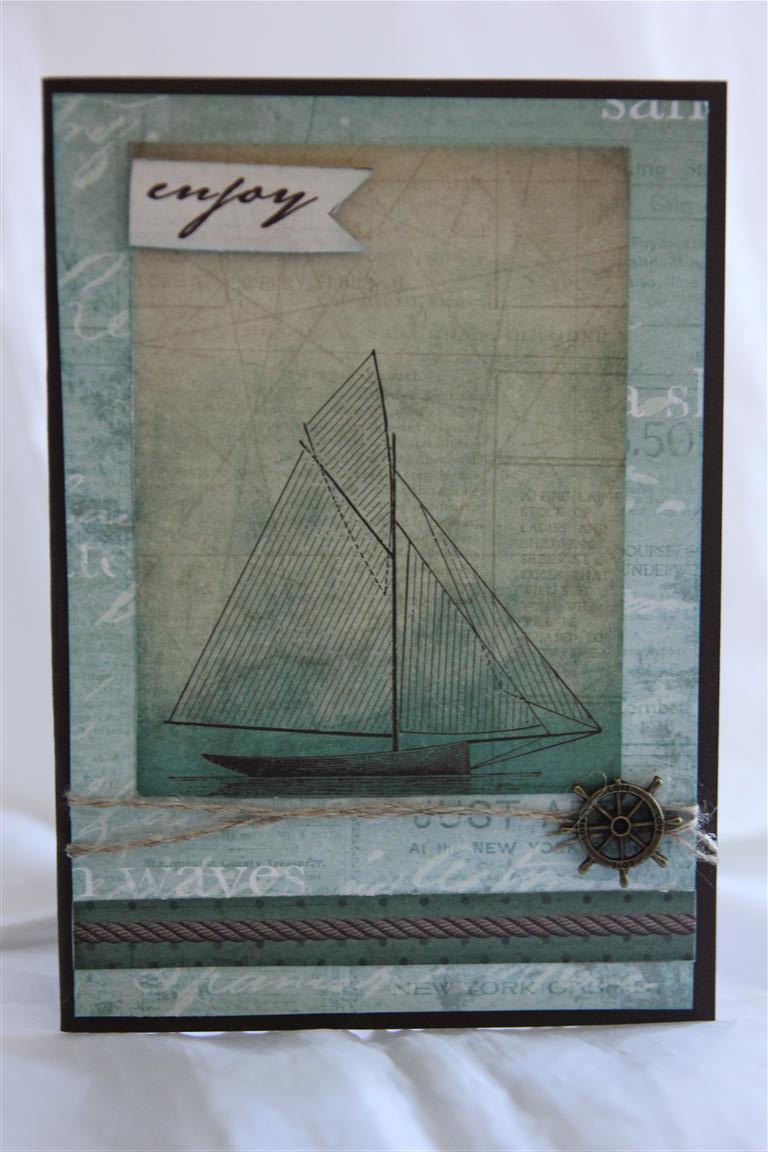 As today is so hot here I thought it would be a good idea to put up a card that makes me feel cool while I look at it! The paper collection is a new release from Kaisercraft – Sandy toes, and is full of lovely patterns and cool colours.I inked around all my edges with shades of blue and green distress ink, and added a bit more colour to the panel with the ship on it too.Wound a little linen thread around my main panel, and added a charm to finish.I am off now to finish wrapping some presents, and then I think I am all organised for Christmas! til tomorrow…..