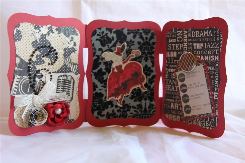 This is a design in progress! I am still working on the best way to attach the three panels together. Here I have used punched circles, but I think long tabs are the way to go, so will try that next. I used the largest Labels eight die in the nestabilities set to cut the Riding hood red stampin up cardstock, and then used an assortment of Kaisercraft Velvet Ensemble paper, chipboard,brad and bling, some graphic 45 dancing ladies paper, and a bit of ribbon.Does anyone know what this design is called? Please let me know! Til tomorrow….