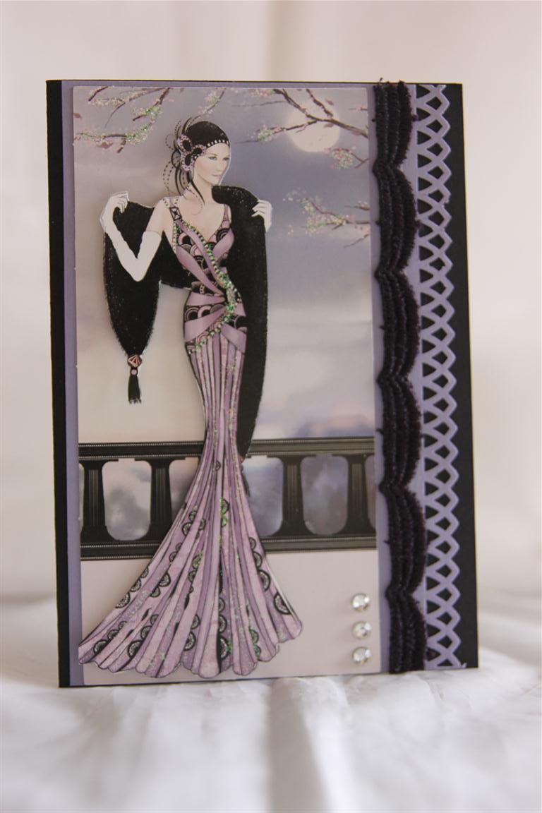 This the third in my Do Crafts Papermania Art Deco series, and tomorrow we move onto something a little different… For this one, I have stayed with the black/purple colour scheme, using black and wisteria wonder cardstock from stampin up. I used a Martha stewart border punch, and then just some black lace and a bit of bling to finish. I have been busy making cards for orders today, but I am itching to get started on the new box of goodies I got on the weekend from Stampin Up – hopefully this evening I will make a start on that! Til tomorrow….