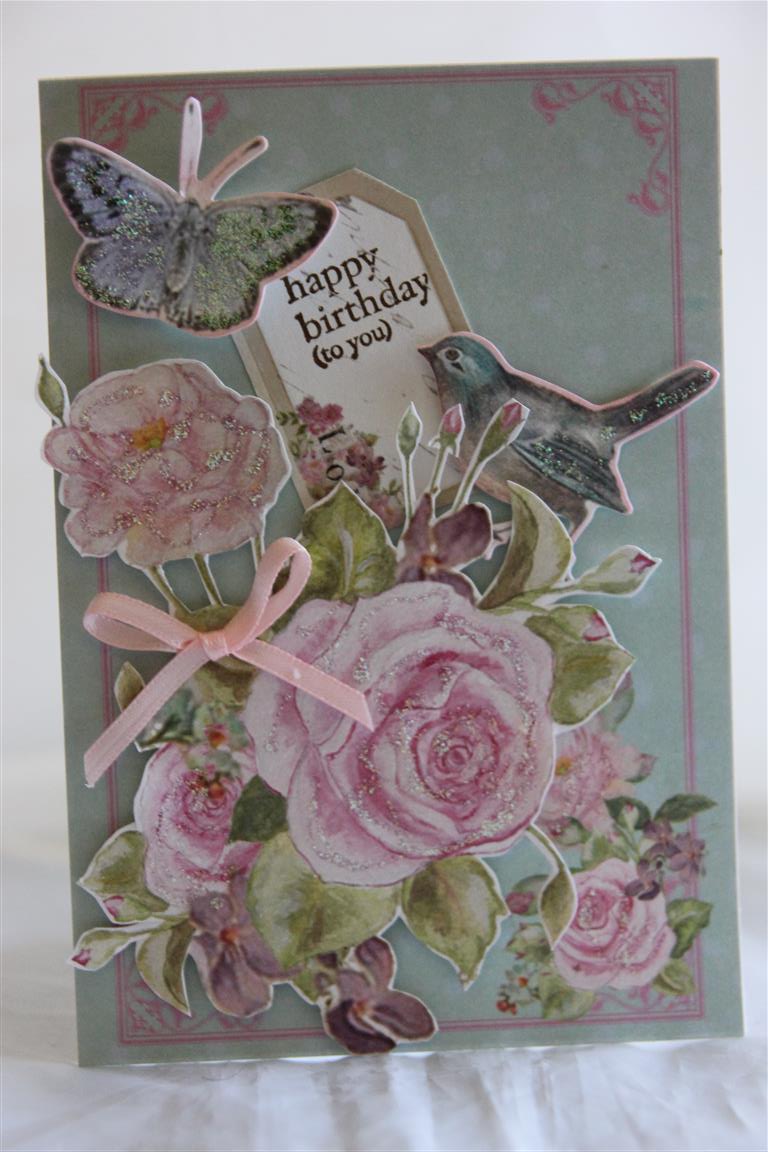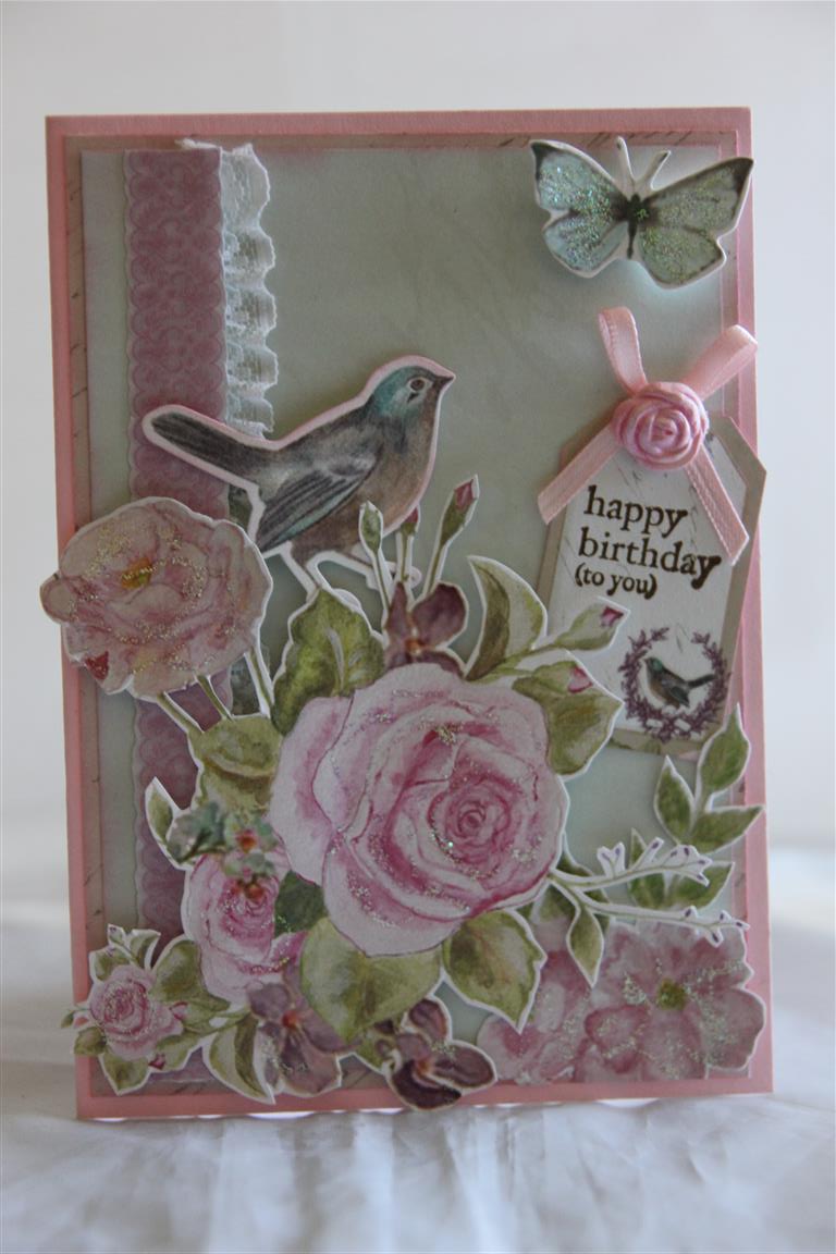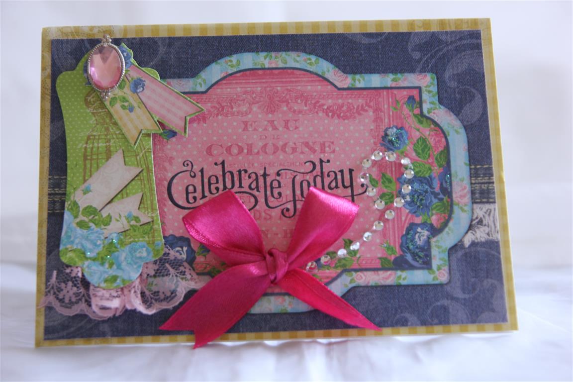 This is a card I made for our cardmakers club challenge. We had to have a go at making ribbon roses, which I failed miserably!In the end I just covered a die cut circle with glue, piled on the ribbon and crossed my fingers, but oh well we all have our weaknesses and making ribbon flowers is mine! I do like the rest of the card though, and for it I used – Stampin Up Pink Pirouette cardstock,spellbinders D-Lite die – ornamental tags two, a cheery lyn die, and Melissa francis paper – C’est La Vie. I added lace, a bling swirl,large pearl and prima flowers to finish. I have had a good afternoon in the craft room today, and I am heading back there now to put my head down and come up with some Ideas for my August classes. Til tomorrow…..