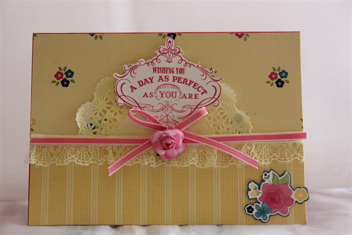 The paper I used on this card is from Stampin up – Gingham garden. Although the colours are quite modern I couldn’t resist giving this one a bit of a vintage twist – by adding ribbon, lace, a flower and a doily which I coloured with my squeezed lemonade distress ink pad. I am quite liking the yelolow/ pink colour combination at the moment1The sentiment is also from stampin up. Til tomorrow…..
