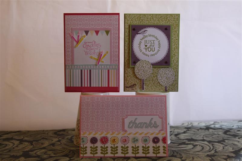 This is the next group of cards made using my 4 sheets of Echo Park springtime collection. I also used stampin up cardstock, Kaisercraft bling and a stamp it stamp (just for you), and the candles were stamped with a stamp from a stampin Up set and cut out. The thing I loved about these papers was they didn’t need a lot of products and although the papers had a lot of different colours and patterns they still went together perfectly. Today I was over at Paper flourish setting up my May lesson, and really splurged on a lot of new paper collections. I got the new kaisercratf ranges, new Prima (2 differnt collections) and the new Bo bunny collection . All gorgeous – so much new paper, so little time! You all know what I will be doing tonight! Til tomorrow….