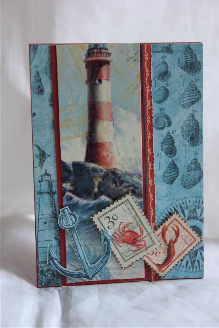 Sorry I was missing last night – we had no power… Nathan said it went off at 1pm, and it didn’t come back on until close to 8 o’clock in the evening, so we sat in the dark, and were quite cold until then! It was a very late dinner last night!Todays card is Graphic 45 By the sea patterned paper, and a fussy cut quite a few images . I mounted the lighthouse on some stampin up real red cardstock, and used a little of the trim from the same paper down the right hand side.This paper is out on my craft desk at the moment, as I was planning to make some more cards with it, but I have a few orders to complete, so will have to pack it up again! til tomorrow…..