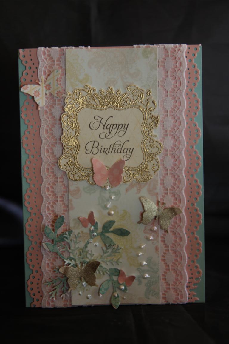 On todays card have made the greeting the focus of the card. I used Stampin Up pool party and blushing bride cardstock, and My Minds Eye Howdy Doody patterned paper. The punches were Martha stewart doily lace, butterflys, and fern leaves. I added some lace and liquid pearls, and rubbed a couple of the butterflies over a versamark ink pad and brushed them with gold perfect pearls ( powder) which gave them a lovely gold colour, and I will be trying this again with my other colours in the perfect pearls range.The Stamp set I used was Stampin Up elementry Elegance, and I gold embossed the frame, and stamped the greeting inside it. Over the past couple of days I have been making male cards, so today I gladly got out the lace, ribbon and bling and had a great time creating some really feminine cards, and I will be back in the craft room tonight as I have a couple of unfinished cards on my table…. Til tomorrow….