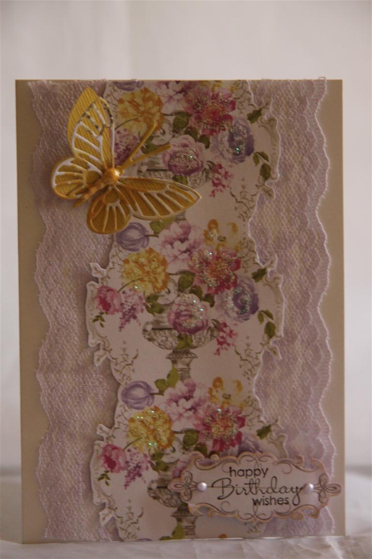 Here is the final Prima meadow Lark card! Although as we speak the collection is sitting on my work table as I am still doing orders and that paper was asked for on two of the cards, so I am not done with it yet although I probably won’t post any more cards with it. Here I really let the paper do the talking – I just couldn’t bring myself to cut into this pretty paper so I made a feature of it instead, fussy cutting around the design and just adding a butterfly ( memory box dies kaliedascope and moonlight butterfly) and some lace and liquid pearls. Tomorrow I think we will have some male cards! Til tomorrow….