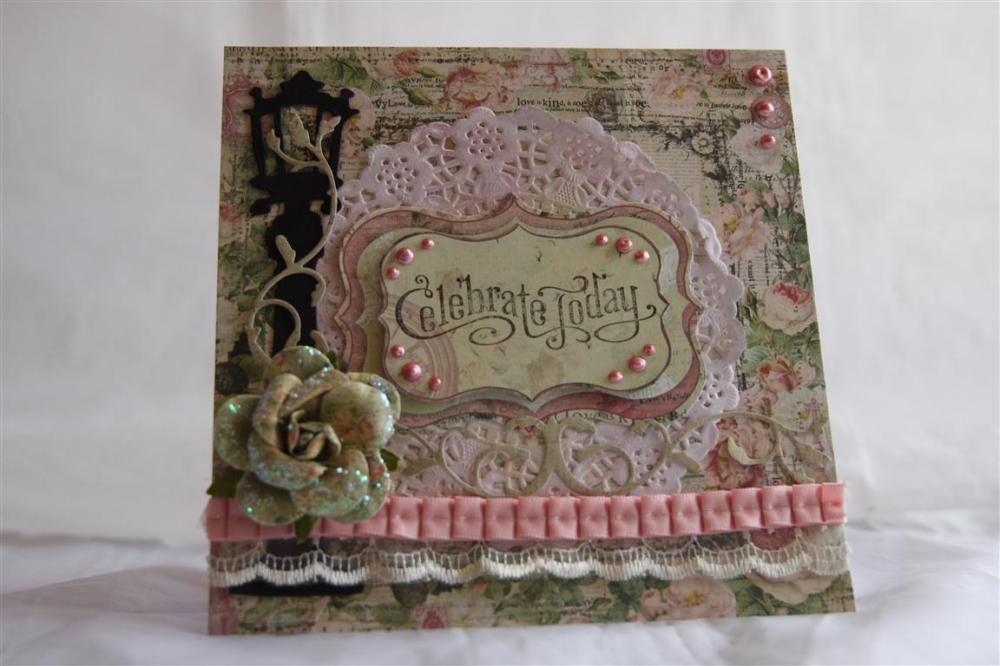 For this card i used the prima Tea thyme patterned paper and also Prima tea thyme flower. The cuttlebug was brought out to cut the Sizzix tim Holtz lampost, and memory box La Rue flourish.embellishments were Stampin Up pleated ribbon, lace,a doily and liquuid pearls.Tonight – a big push on christmas cards and tomorrow a bit of a tidy up. Til tomorrow…