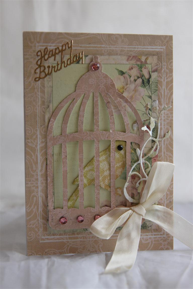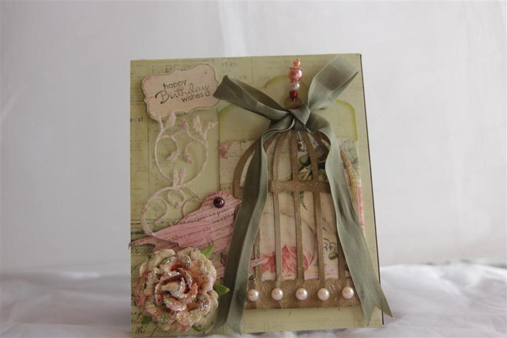 Todays card uses Prima Tea Thyme patterned papers, and a couple of dies – memory box la rue flourish, and Sizzix Tim Holtz caged bird. The bird I used in the cage is from a packet of Prima resist canvas. these are wonderful things! You can colour them to match your project, and when you do a pattern appears on the canvas! Wonderful! I just added some seam binding and bling to finish.I completed my special orders today, and am now back to Christmas cards. It’s back to work tomorrow so probably won’t get too much achieved in the craft room until the end of the week – til tomorrow….