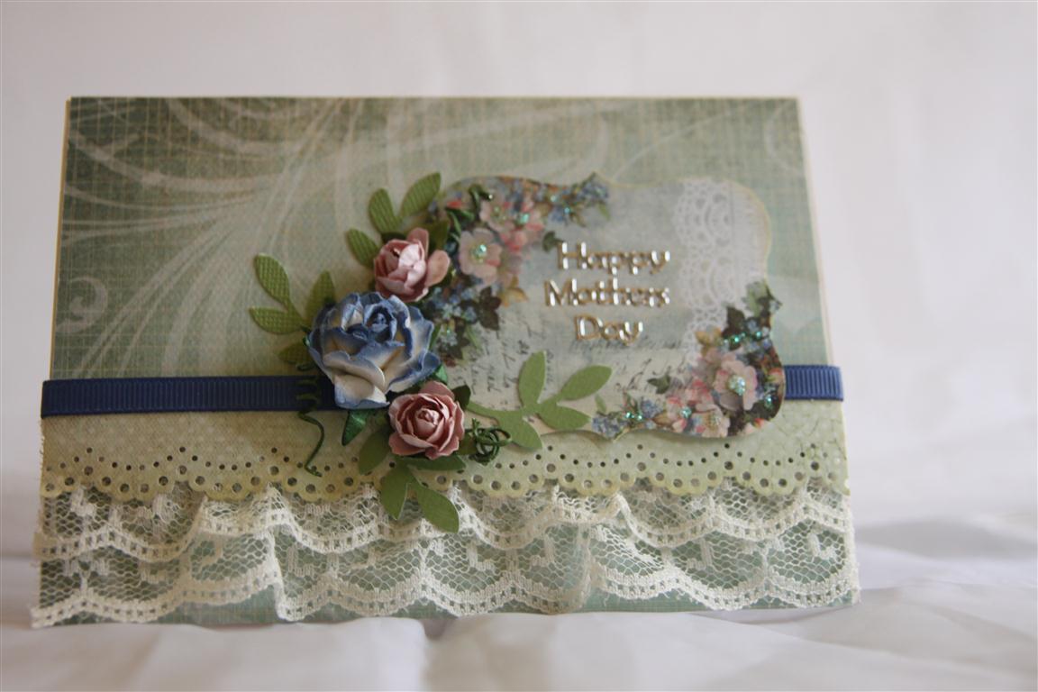 Now I know we haven’t even celebrated Christmas yet, and here I am posting a Mothers Day card, but I need to make 100 Mothers day cards this year, and thought I would do a couple a week to keep ahead. This new paper from kaisercraft – Sweet nothings is perfect for Mothers day, and lately every card I do seems to have a lovely vintage feel to it. For this card I just used the 6″ pad and lace and flowers. I did ink every edge with Antique Linen Ink, and the leaves were punches from my trusty Stampin up bird punch. I love this collection of papers, and it may be one that I go back for seconds for! I have managed to get over a dozen male cards done today, so I am looking forward to getting out the bling and glitz after tea and creating a bit more with this paper! Til tomorrow…..