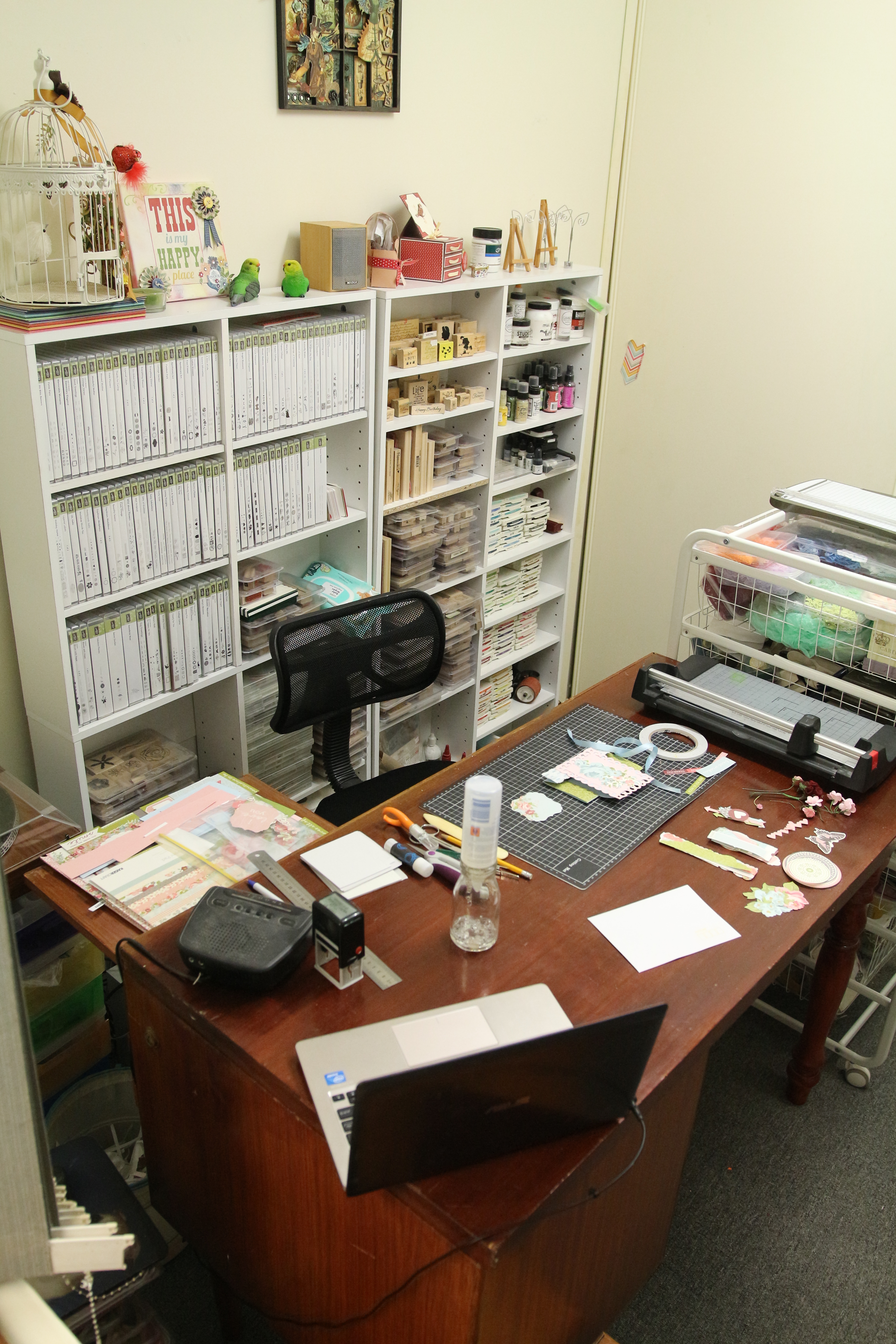 No card today, instead I thought I would show you what has kept me busy this first week of my holidays! I have removed the trestle table, and moved in a smaller desk ( hopefully this will encourage me to keep my desk tidy) and new shelves behind me to hold all my stamp sets and inks.In the drawers in the corner under the record player ( a must) are my distress inks, scrap cardstock, perfect pearls,liquid pearls and embossing powders, while in the wheeled drawers by my desk is my collection of lace and flowers,and punches.On the wall opposite my desk are custom made shelves for all my patterned paper collections. The trestle table has been set up with my big shot, and cricut machine ( I should use it more often now)and all my embossing folders, dies, and cricut cartridges. The built in robe holds all my stampin up cardstock, bling and much more ribbon!I stopped work to make some cards with kaisercrafts new paper collection – Secret garden…(that’s what is on the desk). I love this paper and I am really going to have to force myself to stop creating with it and get back to the sorting out! Back tomorrow with a card to show.. til tomorrow….