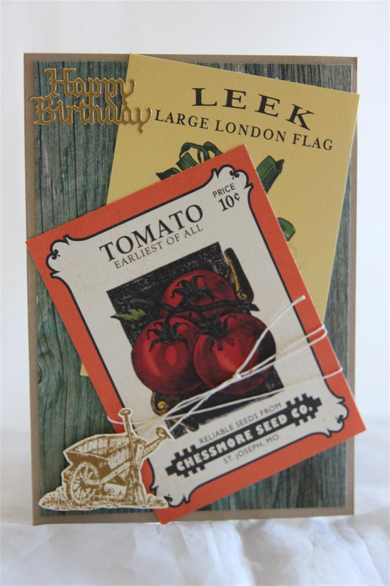 Here it is – the Final October afternoon farm Girl card – what a marathon! Thanks for sticking with it! I always try to make a male card with any of the collection I play with, so this is it for the October afternoon farm Girl collection. I love the woodgrain paper, so it was easy to use it as my first layer, onto a base of Stampin Up Crumbcake cardstock. I cut out a couple of the seed packets, and wrapped one with twine, and stamped a wheelbarrow with my Stampin Up Countryside stamp set.Tomorrow onto something different! Til tomorrow….