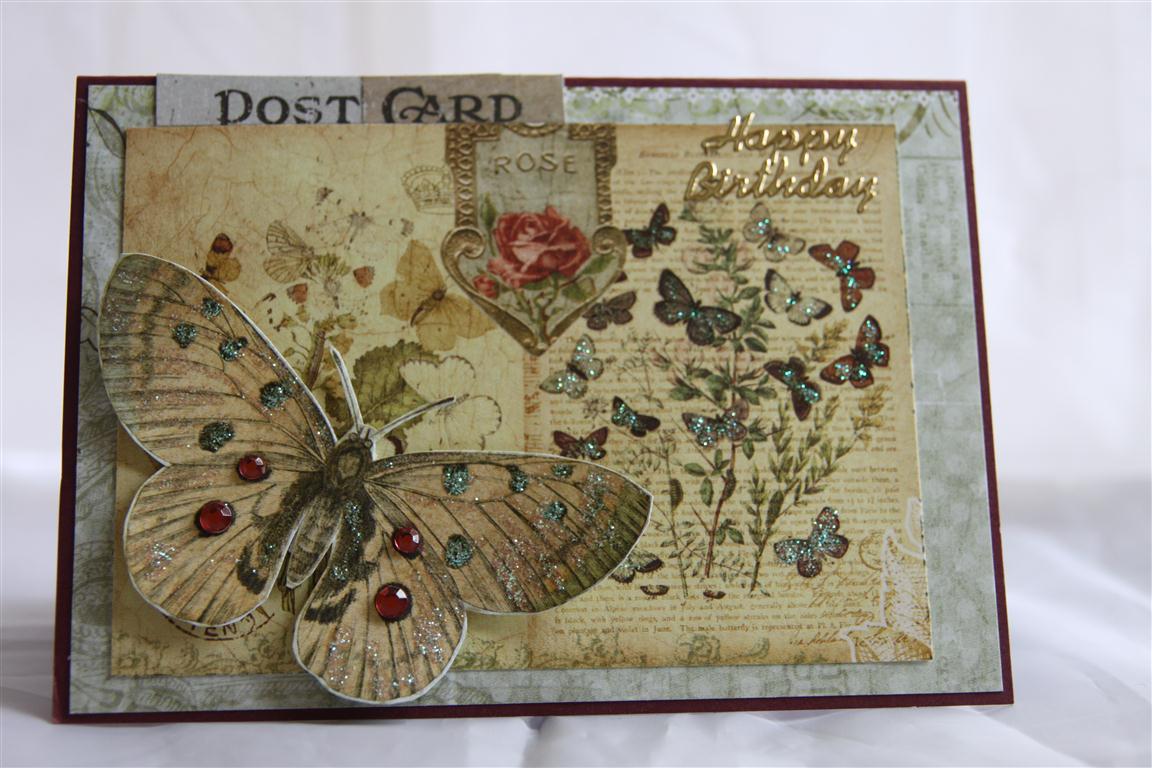 Todays card uses a new paper – Butterfly Garden by Pink Paisley. I only made a couple of cards with this paper because I used the rest to make Birthday books which i will get Nathan to photograph this weekend, and hopefully be able to show you all next week.As well as the pink paisley paper IÂ used a Prima flower, and websters pages lace, and used my versamark pen on the ladies dress, and brushed it with perfect pearls powder – my newest purchase – and I’m loving the effect! Til tomorrow….