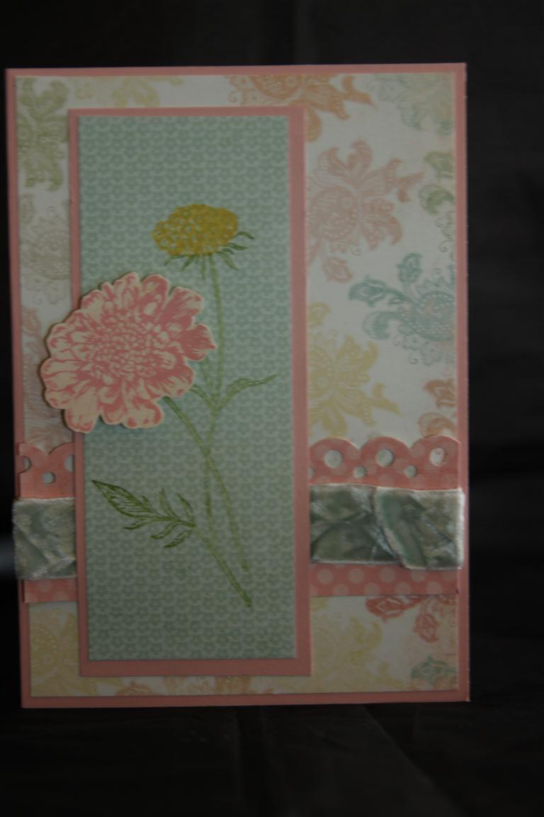 Today I am showing a card that I made using my Stampin Up supplies. The designer paper is stampin Up everyday enchantment ( absolutely gorgeous, and is on my craft desk as we speak, as I am by no means finished with this paper, and my lovely sister has just given me some more) and the stamp sets – petite pairs for the sentiment and Fresh vintage for the stamped image which I coloured with prima chalk ink pads. I just added a little ribbon and lace to finish. Nathan and I did fit in time today to do some photo -ing, but I haven’t sorted through them all yet, but we might have new stuff tomorrow… Til tomorrow….