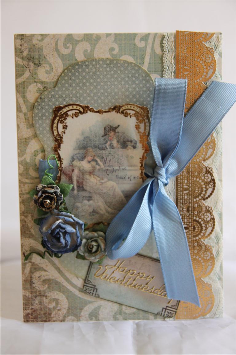 When I use 6″ paper pads, I always end up with 2″ strips left over, so for this card I used 2 of the strips, and ran some lace down the join. The paper , flowers and chipboard are all from the Prima Tea Thyme range, and I added a little bling flourish.I am making good headway sorting through my old papers, making the occasional card as I go, and collecting a little pile to give to my sister ( who has just started making cards) and my mum. I will have a little break tonight as I bought some gorgeous wool today, have dug out my knitting needles, and am going to start on a scarf ready for winter! Til tomorrow….