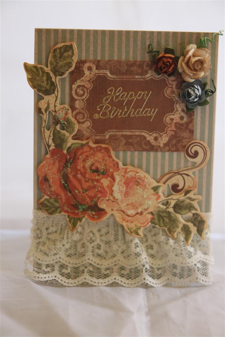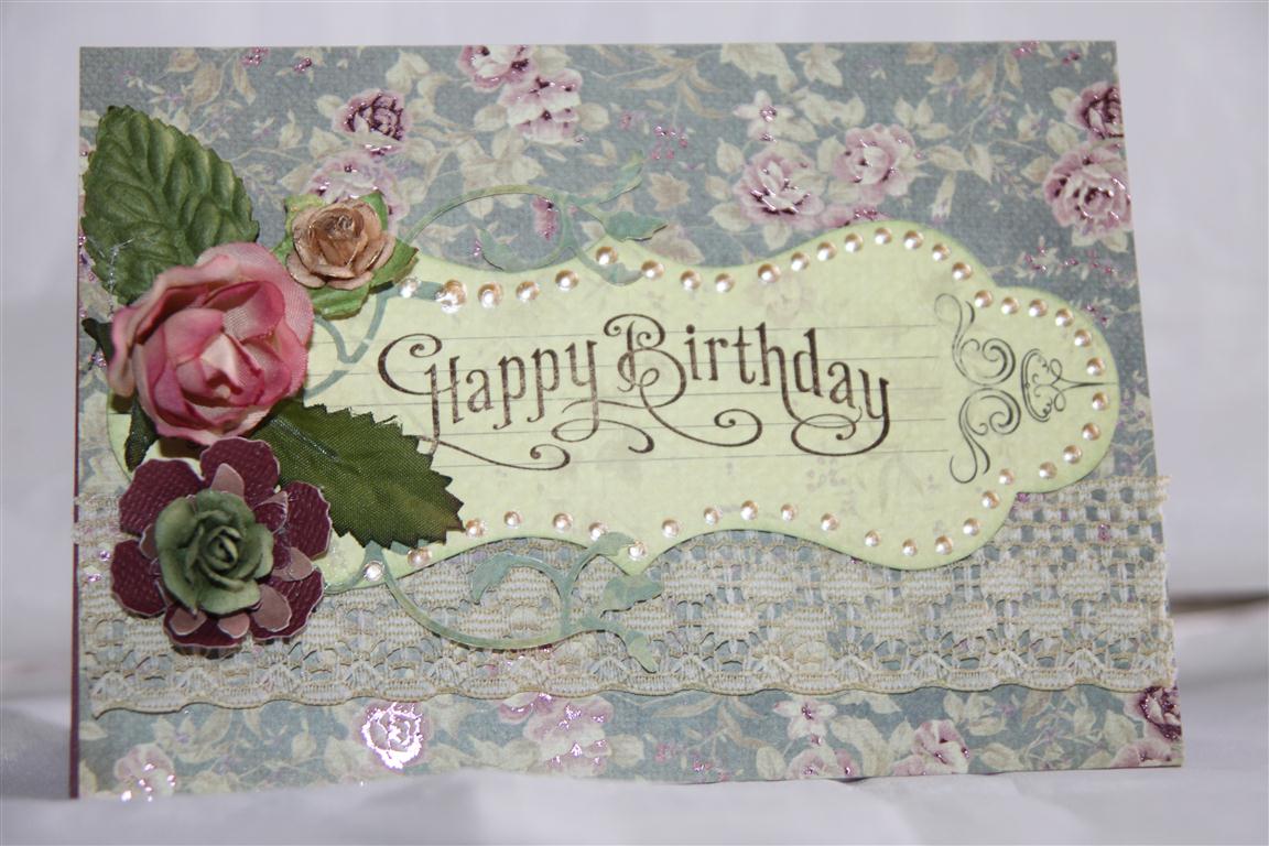 Here is todays card which is the last in my kaisercraft Magnolia grove series. I have used the 6″ pad today with a label from the matching collectables pack. I added a vintage rose, prima flowers, and liquid pearls and lace . With my cuttlebug I cut a memory box Fauntleroy crest and a couple of flowers with my sizzix tim holtz tattered flower garland die.The greeting is stamped using a stamp from my stampin Up perfectly penned set.I think all the travelling has caught up with me today as I am a bit tired, so I will have a break from the card room tonight and watch some T.V. I think… Til tomorrow….