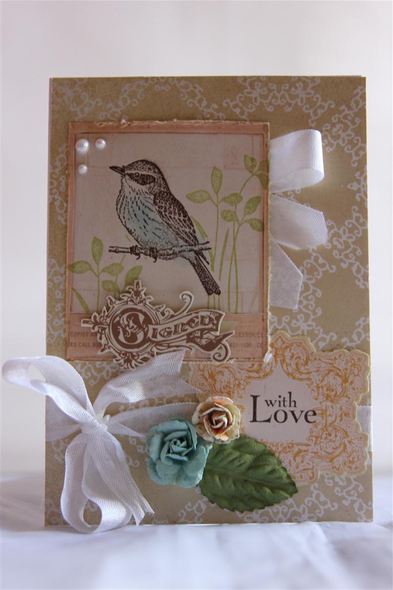 Yesterday while I was teaching my lesson I discovered that the new Prima collections were in store, so I purchased quite a bit of paper! When I got home I realised that I hadn’t even cut into some of the previous Prima releases, and so today I rectified that! I decided that I couldn’t touch the new stuff until I had at least played with some of the older collections and took out all my Prima Songbird paper ( which only turned out to be 4 sheets – not sure why thats all I bought of this collection – it’s gorgeous – I can only think that by the time I saw it this is all that was left of it) . Anyway I had 4 sheets, One was immediately fussy cut into lots of bits and pieces, which left 3 pieces for backing and matting. I made 11 cards, and that is another collection finished.Over the next couple of days I will show all the cards I made with my 4 sheets, as Nathan was very obliging and photoed them for me this afternoon – a couple of them were still drying! This card was the last one I made and it’s my favourite. I had very little paper left, so dug out my stamps to come up with this one. The bird stamp is stampin up young vermillion ( a favourite), and the leafy background is from the stampin up just believe set. The with love greeting is from stampin up field flowers set. Inks used were stampin up certainly celery,choc chip,baja breeze, and ranger tim holtz antique linen. I added white seam binding,prima flowers,and white perfect pearls to finish. I am on a creative roll now, so am heading back into the craft room to start on another collection. Til tomorrow….
