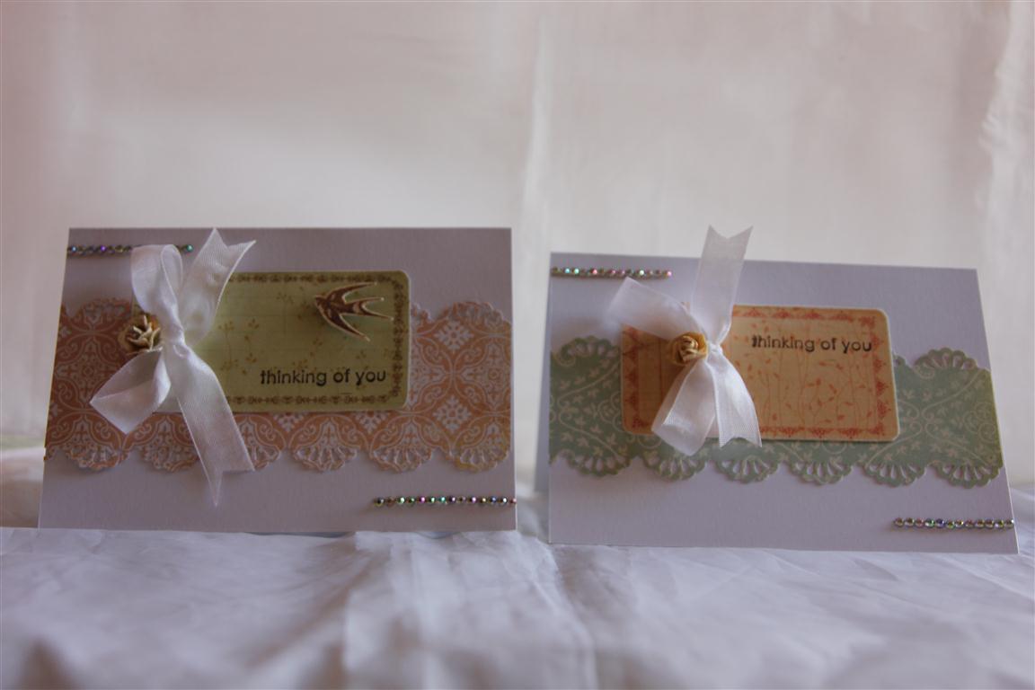 Here are the other two cards i made while I had the Kaisercraft English Rose paper out. I used Stampin Up cardstock ( pink Piroutte) for the bases, and my Stampin Up bird punch, Martha Stewart lace doily punch, prima flowers, hand rolled flowers, ribbon and bling. Settling back into work, what a rude shock to the system! Many books in the stockroom still in boxes, but I have been given some help, so we should be caught up by next week! Til tomorrow….