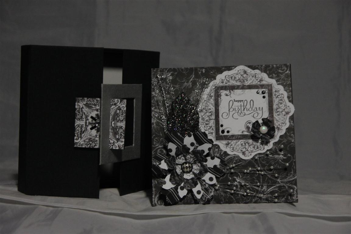 I made this card for my Boss’s birthday, and when it was made I realised it wasn’t going to fit into the envelope without ruining the whole effect of the flower, so I came up with this matching box, which was so successful it resulted in a rather large order, and more coming in all the time, so at the moment I am up to my eyes in cards in boxes!I will show a couple more over the next couple of days, but now the challenge is to make some male themed ones – that’s the next order I will be working on over the weekend. Anyway, for this one I used Bo Bunny enchanted patterned paper, and matching brads, and my sizzix tattered floral die with a prima leaf and sprays of pearls. Once you have the hang of these boxes, I have discoverd it is quite easy to change the size to match any size card, the only thing to remember is to keep the measurements within 12 x 12, otherwise you will run out of cardstock! Til tomorrow….