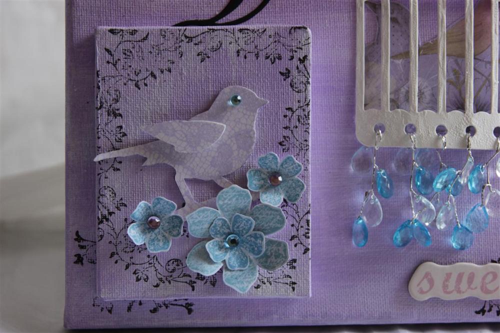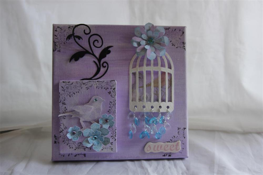 Every now and again an idea is too big for a card,and so it was with this one, so i moved it onto canvas.I painted the canvas with acrylic paint, added some stamping in black stazon,and then started decorating! The flourish is a cheery lyn die – tropical flourish, bird and cage is sizzix tim holt caged bird, and the flowers up the top are die cut with sizzix stampin up Blossom party die, and down the bottom stamped using stampin up vintage vogue stamps and then fussy cut and assembled.I attached a small canvas onto the bigger canvas, and the bling at the bottom of the cage is Magnolia chandelier garland.The small ammount of paper I used is Prima Meadow lark.I am still amongst xmas cards, but see light at the end of the tunnel, and hope tomorrow to move on! Til tomorrow….