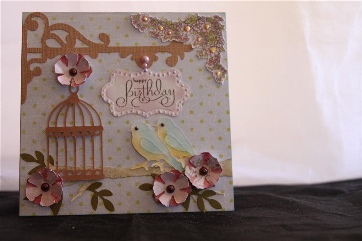 Todays card is one I made, being inspired from a craft magazine, but I didn’t have any of the dies they used so I adapted what I had here. I think it turned out quite well…The list of products used – Prima Sparkling spring papers, sizzix die – tatttered florals, leaves punched with Stampin Up bird punch ( wouldn’t be without that punch!), birdcage – cricut cartridge “Serenade” and lightly inked, spellbinders – Bird sanctuary ( for the birds which I sponged inked for colour) and Twisted metal tags. I hand cut the branch and lightly inked it, and finished with kaisercraft pearls and perfect pearls.Now today I am finishing off and order and then I have 4 new paper collections to play with over the week end so looking forward to a crafty weekend! Til tomorrow…..