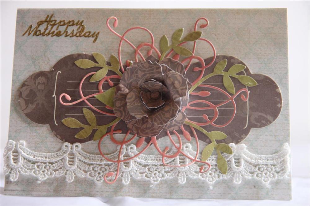 This one is kaisercraft these days papers, Sizzix tattered Florals and 3D Flowers dies, and memory box lord faunterloy die. I added a doily, lace, punched leaves, and the greeting was stamped with a stampin Up stamp – Blessed Mother. I like these colours – they make a change from the usual pinks that i often grab for Mothers day cards – What do you think? I will be found in the card room for a little while tonight, making some boys cards. til tomorrow…..