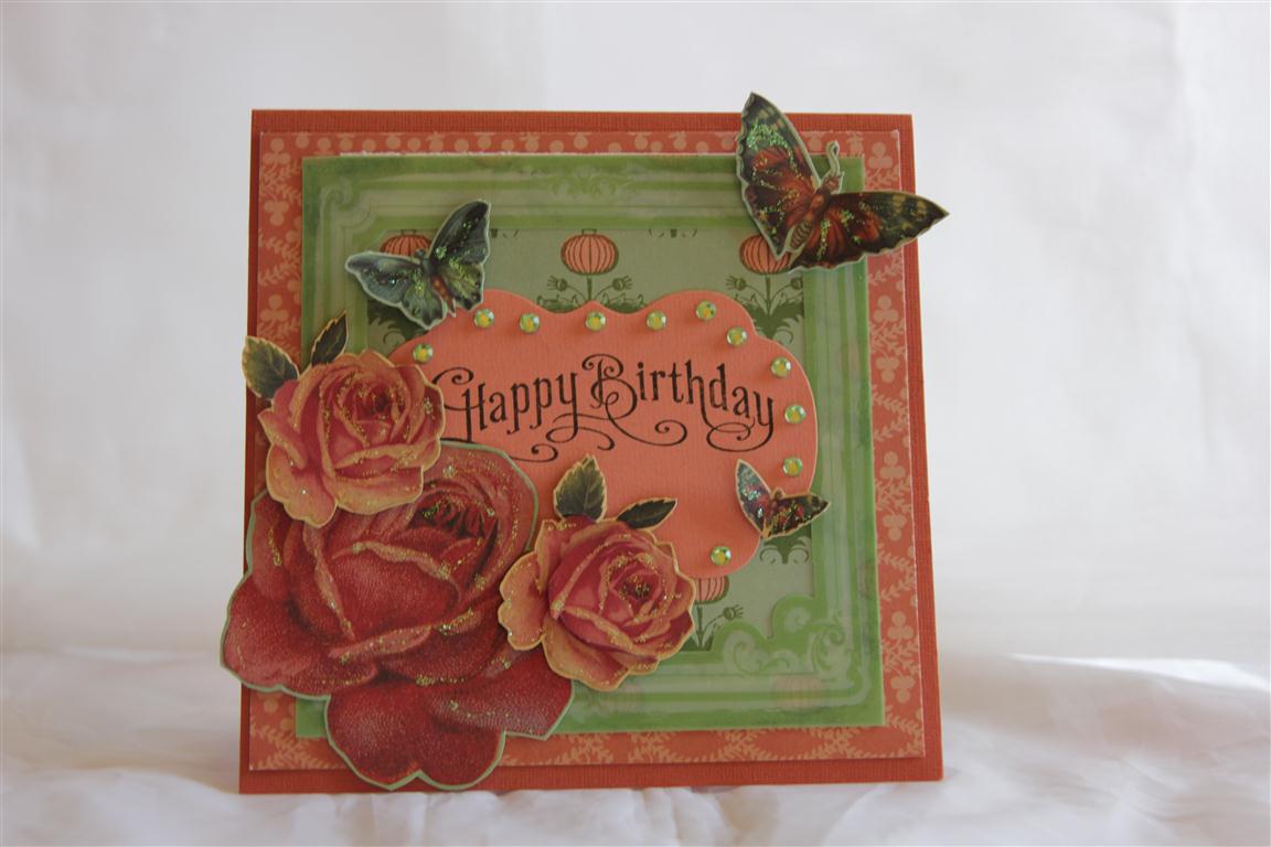 I only bought a couple of sheet of this paper to make this card for my Auntie who is really not a pink blingy lady.It is Cosmo Cricket Evangeline – Rose and Dandelion. I fussy cut all the flowers and butterflies out of the Rose paper, and the dandelion sheet was good for backing paper. I found the acetate frame in my box of bits and pieces, and die cut the greeting with Spellbinders label fourteen out of some Bazill cardstock. The greeting was from my Stampin Up Perfectly penned set.It has been a lovely day here, and I have spent some time sitting out in the sun – lovely! Til tomorrow….