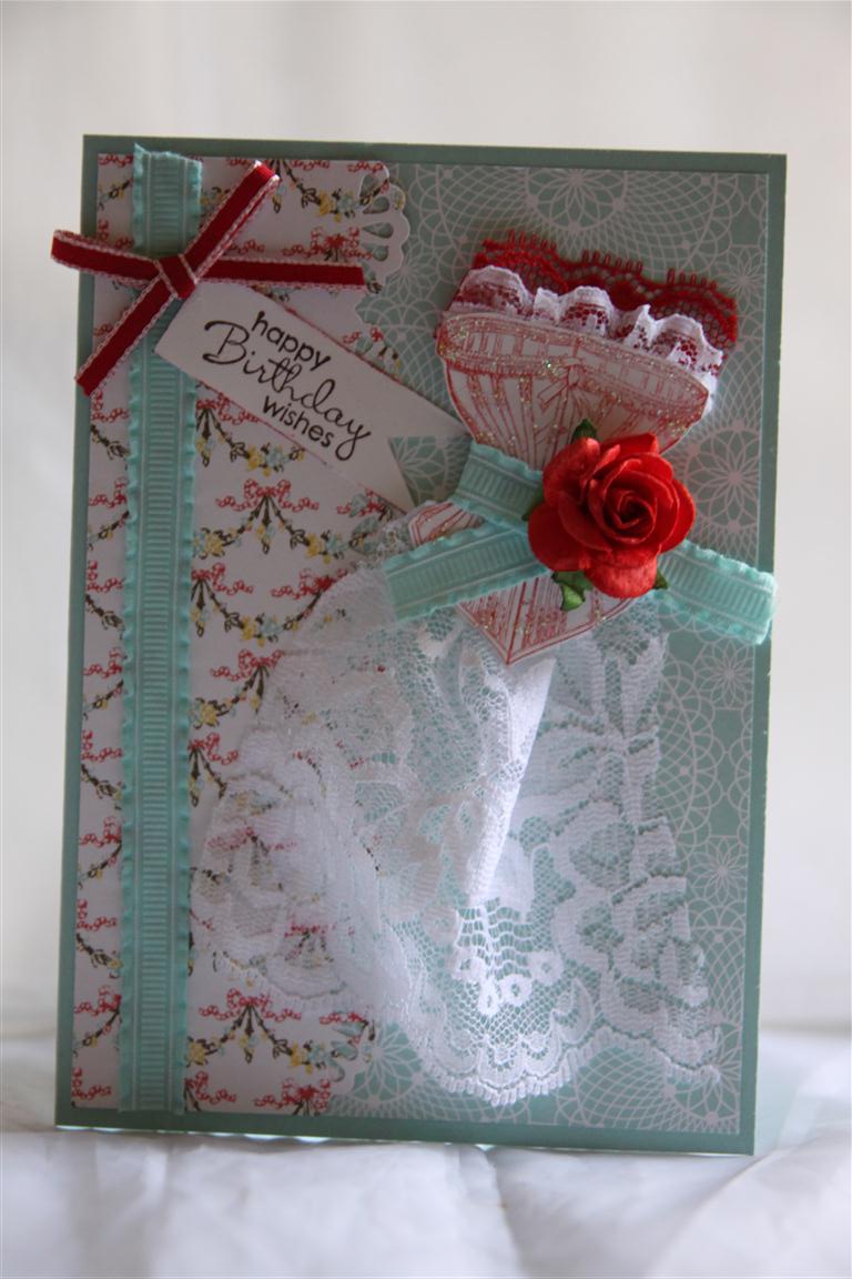 I still have a couple of male themed cards to show in my last series, but I have abandoned them for the time being, as i felt in the mood for something really girly! I thoroughly enjoyed making this card, as it fulfills all my crafting enjoyment requirements – a bit of fussy cutting ( the bodice was cut from an image from Stampin Up attic Boutique paper collection) and lots of lace and bling! The background paper is also from Attic Boutique ( stampin Up) and the cardstock is Stampin Up baja breeze. I tied a narrow ribbon and flower around the waist, and the skirt was made from a very wide piece of lace that I picked up from Spotlight.I added Kindyglitz to the bodice.