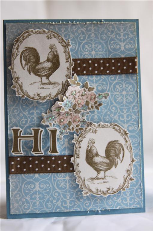 Todays card is one I made using Stampin Up Beau chateau designer paper, Marina mist cardstock, and stampin up stamps – Young Vermillion and a flourish (which I clear embossed) from Friends 24-7. I also used a My minds eye brad and some gorgeous embossed satin ribbon. I did some fussy cutting from other sheets in the designer collection for the flowers. This paper is a favourite at the moment, the colours are great. No cardmaking today as I am still sick,hoping I will be better for work tomorrow, but we will see. Til tomorrow….