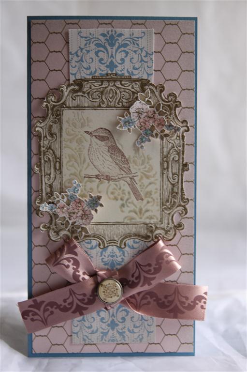 I have spent a lot of my time in the last few days searching for some paper that I thought I had bought( haven’t found it yet, and am fast running out of places to search!) and in my searching have found lots of other forgotten papers that have gone in and out of fashion, and are back in now and will benefit from being used with some new dies and embossing folders that I have bought in the meantime, so next on my list is to use up these papers. First up is this card, made with Stampin Up Beau Chateau, which is a retired paper, but I have rejuvenated it with some fussy cutting, and cutting a banner.The sentiment stamp is from Stampin Up Vintage verses, and I used 2 different kinds of ribbon on the card as well.Taught a lovely group of ladies this morning – we had a great time.. nothing better than card making when the weather outside is so cold! Til tomorrow….