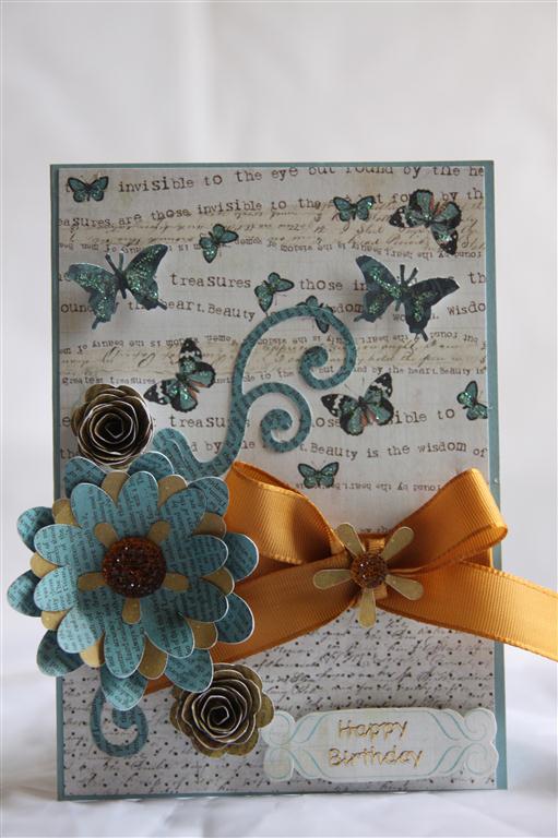 Butterflies are always popular on cards, and this paper by Prima reflections is beautiful. I did a lot of die cutting on this card – I used stampin up sizzix dies blossoms and flourish, and a sizzix 3d flower die. I used a Kaisercraft sparklet or two and some gorgeous satin ribbon to finish.Today i have been colouring some xmas images and tonight I will put some xmas cards together. Til tomorrow…..
