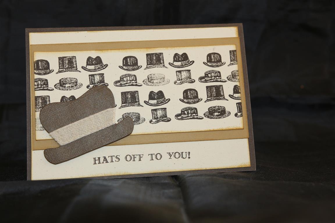 I recently bought a stamp set from stampin Up called guy greetings. I haven’t had nearly enough time to play with it as much as I want to, but have managed to make a few cards using it which I will show you all over the next day or two. It’s brilliant for mens cards, and I made this one for My younger son Daniel who will be graduating from University in a couple of months.The cardstock I used was also from Stampin Up – Early espresso, soft suede and very vanilla.I inked around all the edges for a bit of definition, and the hat is die cut from a sizzix die – Top hats and Mustaches ( tomorrow I will show you what i did with the Mustache!)I added a little frim around the hat for a bit of texture.A card is just not finished without texture!Hot,hot hot here today, so although I really feel the need for some relaxation in the craft room after a hard first week back at work, the day may be spent under the air-con duct reading a good book! til tomorrow…..