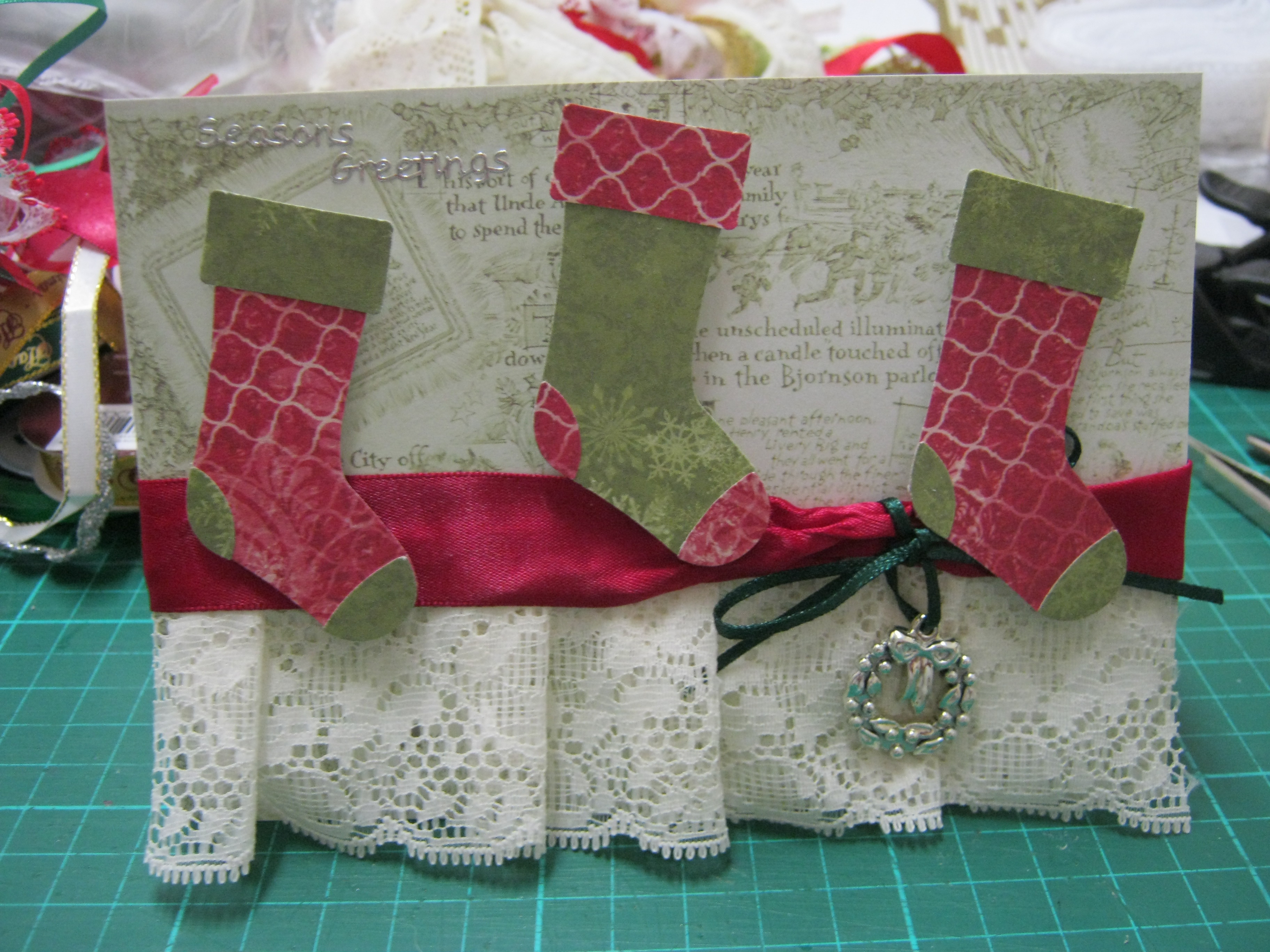 This one is a favourite – Melissa francis deck the halls paper,ribbon, lace and a charm! The stockings are punched with the Stampin Up stocking punch. This punch is great for using all those strips of scrap paper and the end result is great too. Tonight if I get a chance I am going to create some birthday cards, as my boxes are still empty from my last market visit Til tomorrow…..