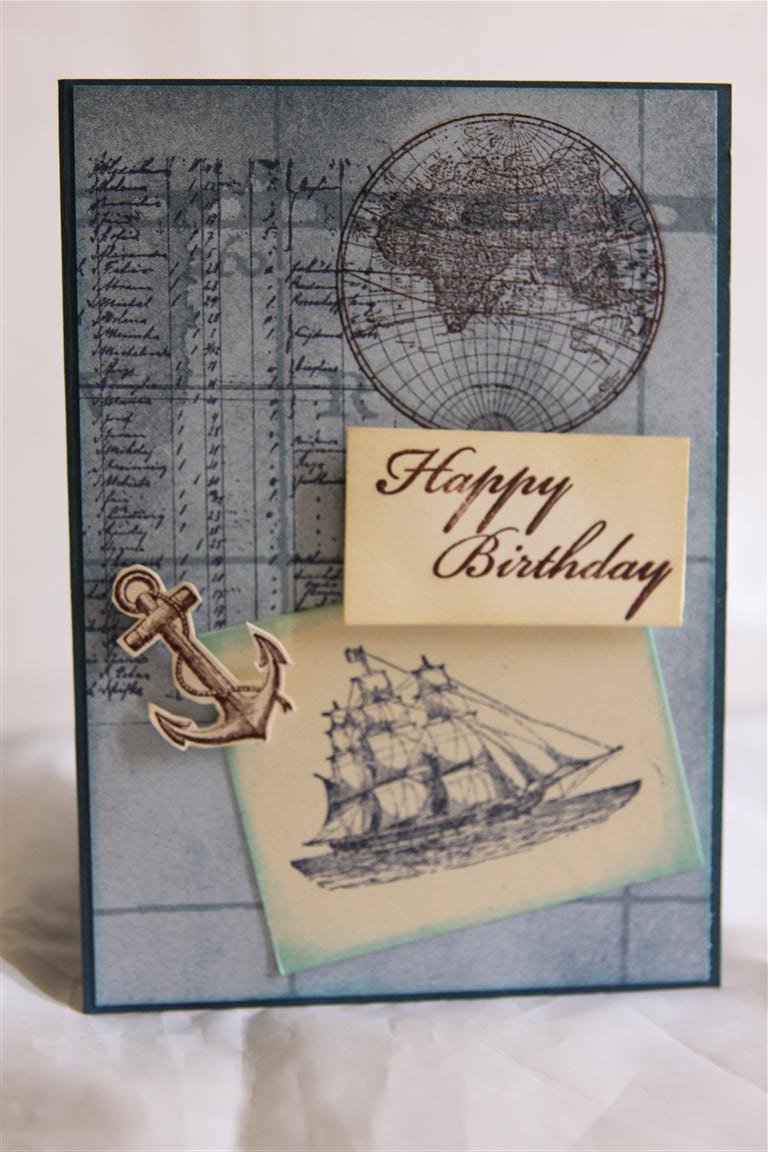 I have abandoned my sweet nothing series for a while as we have filled a whole week with them and I thought it was time for a change of scenery, so today I want to show a card I have made with my most recent Stampin Up purchase. It is a stamp set from their new mini catalogue called The Open sea, and I have used the matching designer papers called Nautical Expedition. I stamped all the images with Chocolate Chip ink.Not much more to this one! I have spent the afternoon at Mums making some Boy type cards, as I have neglected them lately! Time for tea, so Til tomorrow….